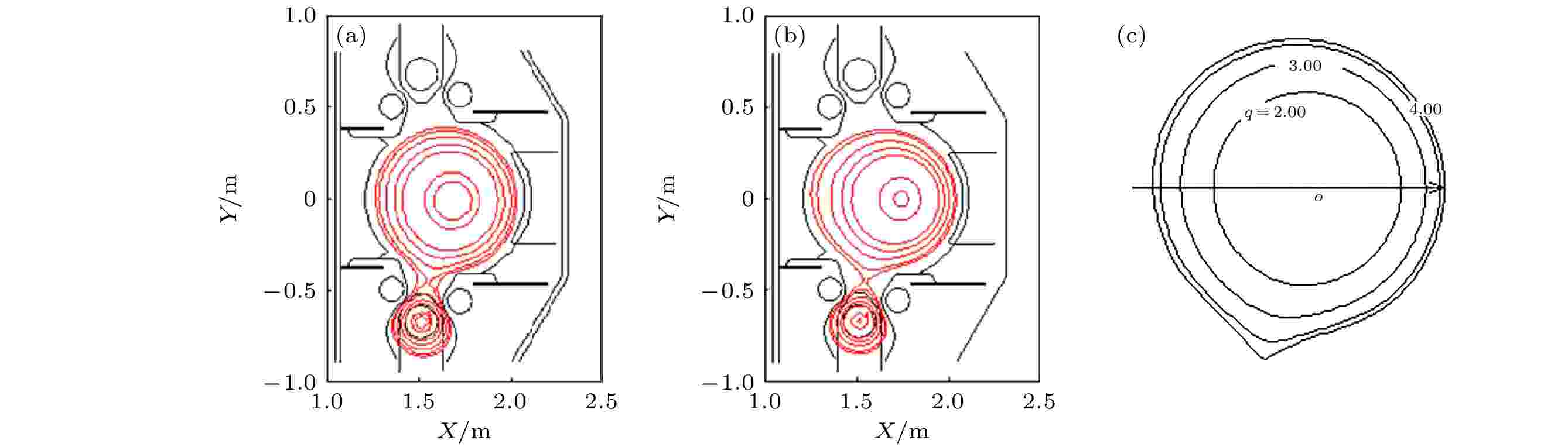 $ {q}_{0}=1.05 $ , (a)$ {\beta }_{\rm{p}}=0.45 $ 时与(b)$ {\beta }_{\rm{p}}=2.00 $ 时的平衡位形; (c)$ {\beta }_{\rm{p}}=2 $ 时, GATO计算的安全因子(q)剖面(由图2(a)与图2(b)对比得知,$ {\beta }_{\rm{p}} $ 越大, 等离子体Shafranov位移越大)Fig. 2. When