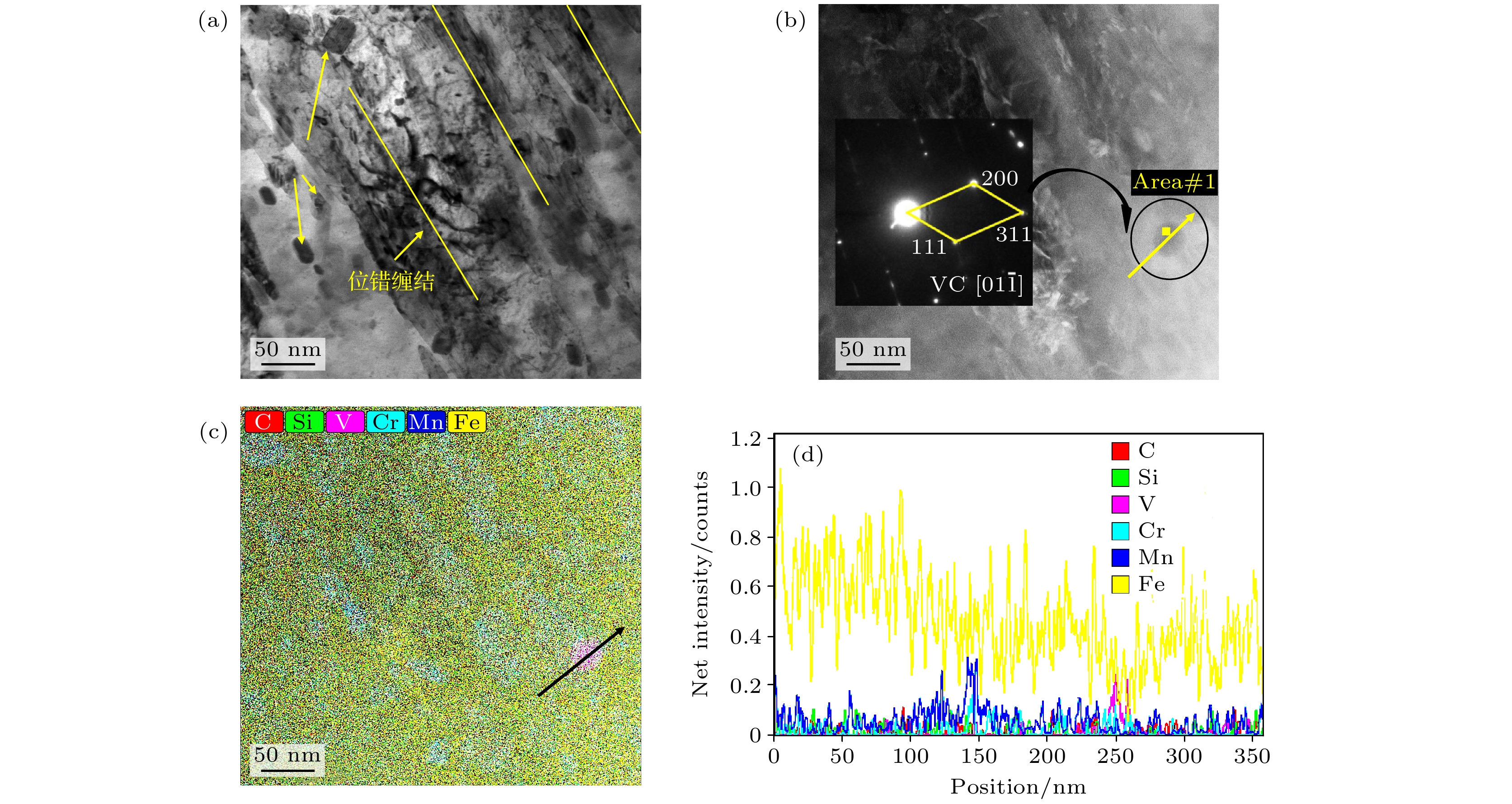 图 1 试样钢微观组织以及定性表征元素分布 (a)微观组织形貌; (b)高角环形暗场像; (c) HRTEM-EDS能谱面扫和(d)线扫图