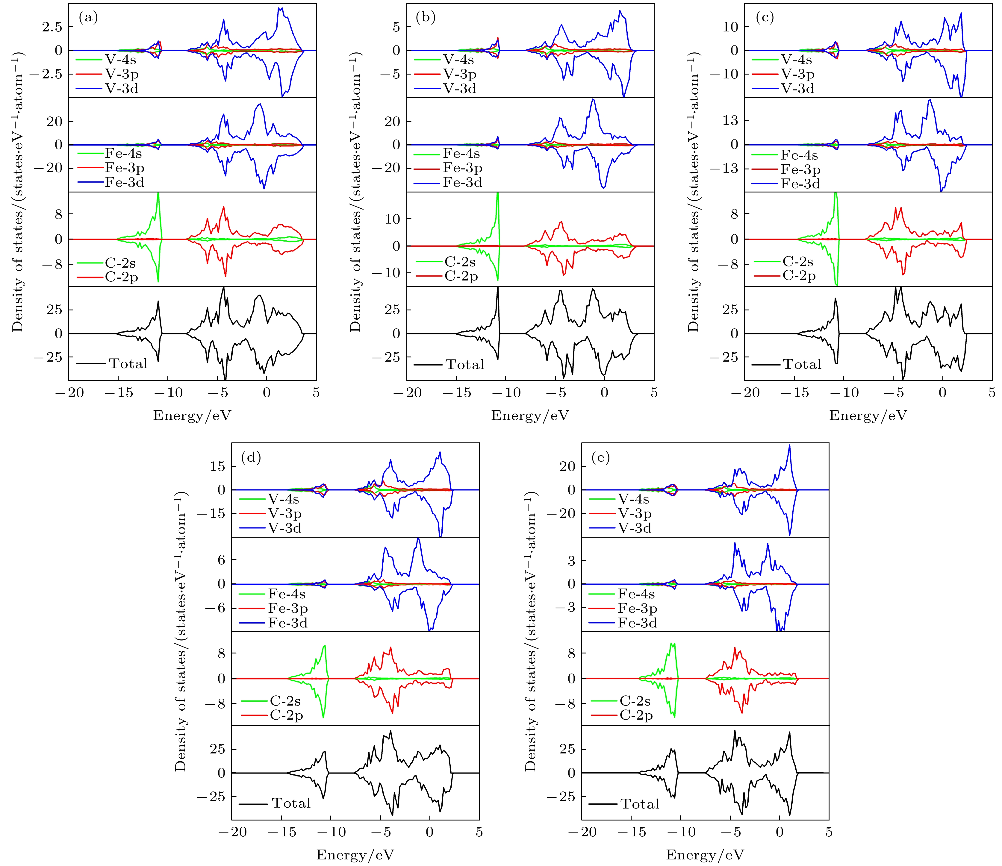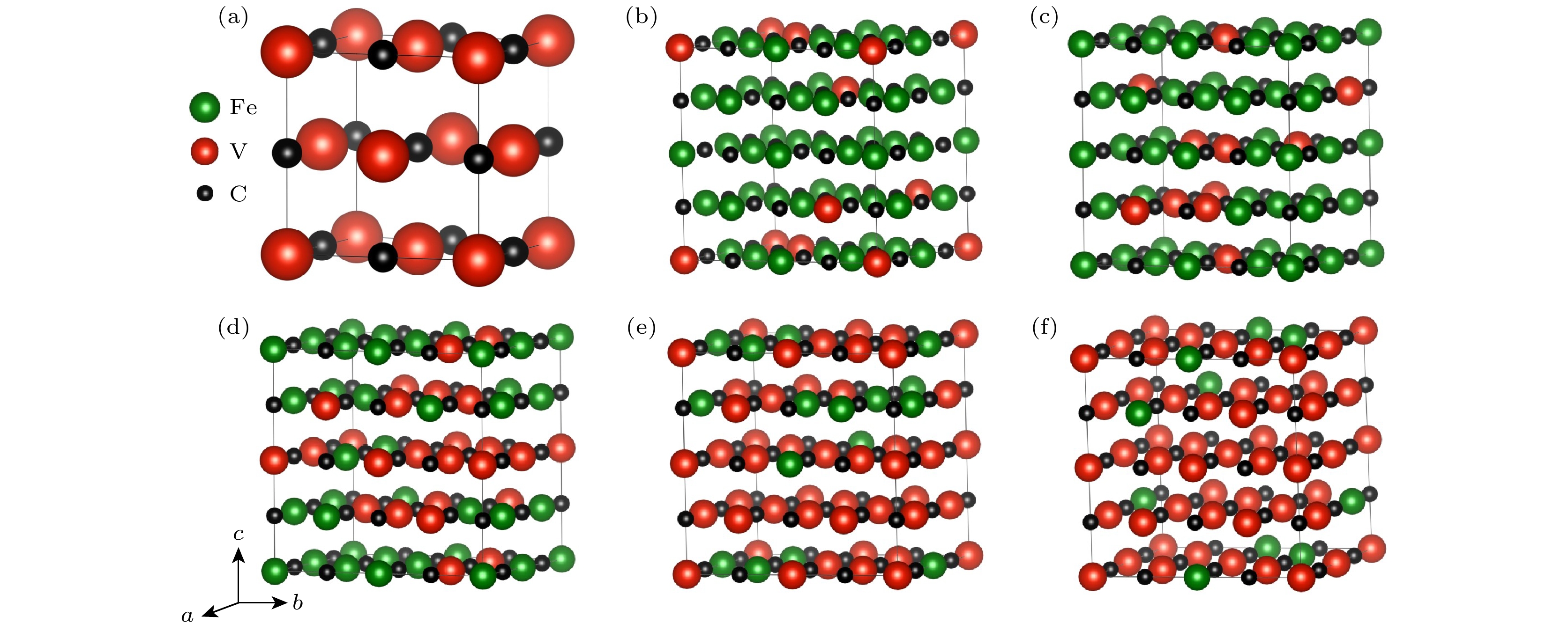 a/Å b/Å c/Å $\alpha $/(°) $\beta $/(°) γ/(°) ΔHf/( meV·atom–1) fm Bader V0.125Fe0.875C 8.061 8.065 8.063 90.08 89.99 89.95 0.443 0.548 0.840 V0.25Fe0.75C 8.106 8.107 8.107 90.00 90.00 90.01 0.321 0.622 0.914 V0.5Fe0.5C 8.203 8.188 8.195 90.00 90.00 90.00 0.042 0.844 1.052 V0.75Fe0.25C 8.262 8.261 8.258 89.92 90.08 89.99 –0.230 0.971 1.146 V0.875Fe0.125C 8.287 8.287 8.288 89.93 90.00 89.97 –0.439 1.19 1.213 表 3 V1–x FexC碳化物的弹性常数Cij、体积模量BH、剪切模量GH、杨氏模量E、泊松比$\nu $、普格模量比BH/GH、硬度HV、断裂韧性KIC以及脆性指数$ {{M}}_{{x}} $