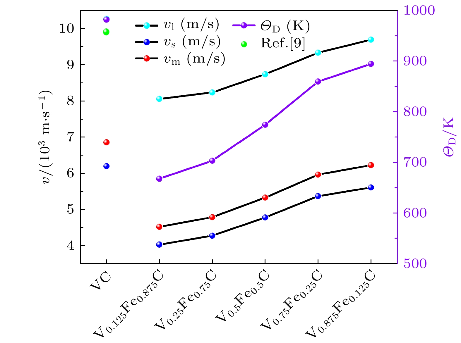 V0.125Fe0.875C V0.25Fe0.75C V0.5Fe0.5C V0.75Fe0.25C V0.875Fe0.125C [100] [100]vl 9003.42 9126.02 9446.38 9820.16 10182.71 [010]vs1 3323.25 3606.30 4236.44 4976.31 5223.03 [001]vs2 3323.25 3606.30 4236.44 4976.31 5223.03 [110] [110]vl 7982.57 8144.52 8639.03 9233.81 9600.33 $[1{\bar 1}0] $vs1 5327.68 5473.24 5705.14 5994.67 6229.07 [001]vs2 3323.25 3606.30 4236.44 4976.31 5223.03 [111] [111]vl 7611.92 7789.92 8352.592 9029.91 9398.19 $ [11{\bar 2}] $vs1 4754.38 4930.12 5261.33 5675.55 5912.77 $[11{\bar 2}] $vs2 4754.38 4930.12 5261.33 5675.55 5912.77 表 5 V1–x FexC碳化物的格林艾森参数γ, Aγ, $\delta $, Mav, 晶格热导率kph以及最小晶格热导率kmin