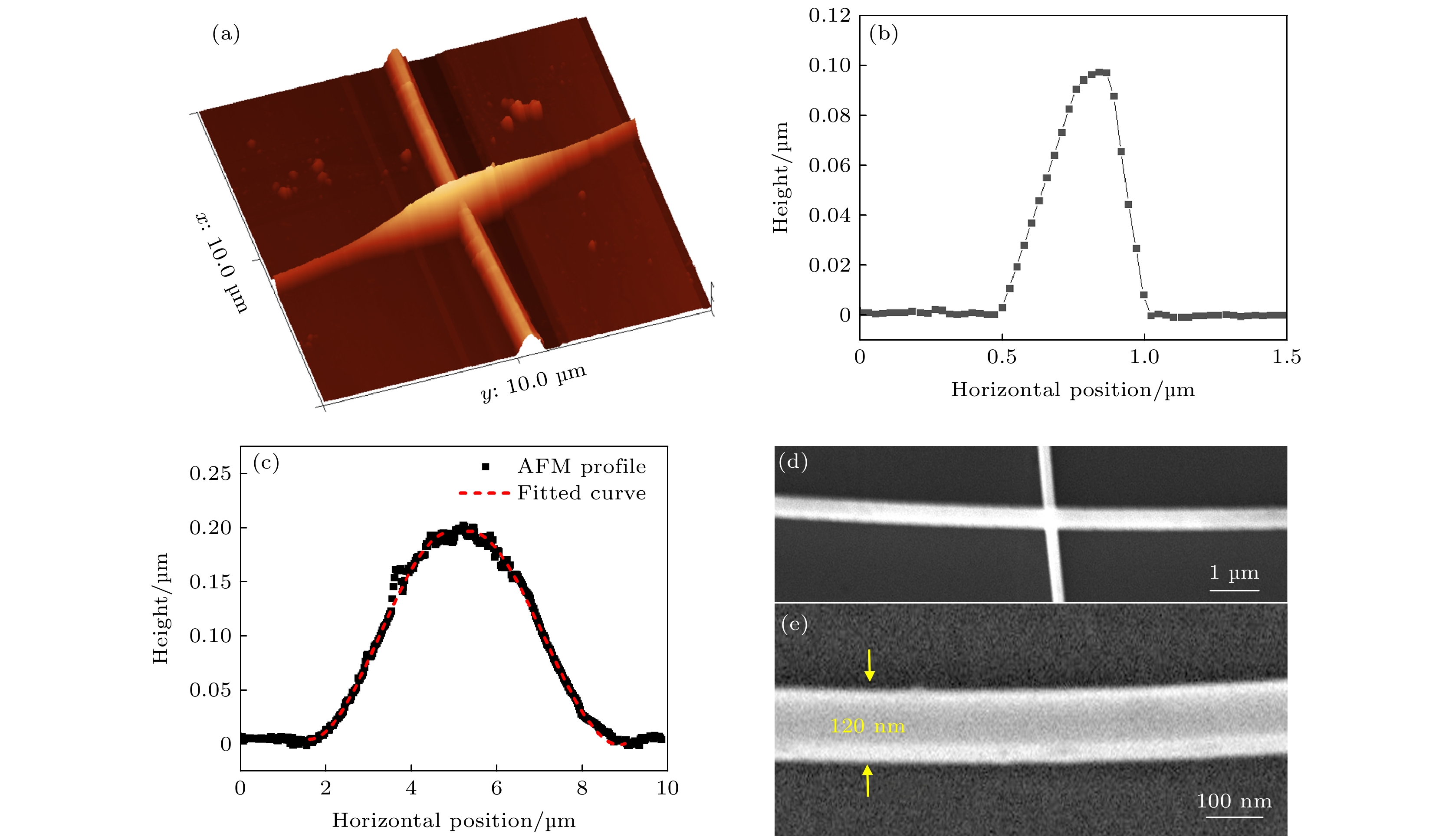 图 4 Si基底上SiC纳米线拱形 (a) 拱形的低倍AFM照片; (b) 纳米线横截面的2D AFM照片; (c) 纳米线拱形轮廓的2D AFM照片以及拟合的轮廓曲线; (d), (e) 纳米线拱形的低倍SEM照片和纳米线的高倍SEM图片