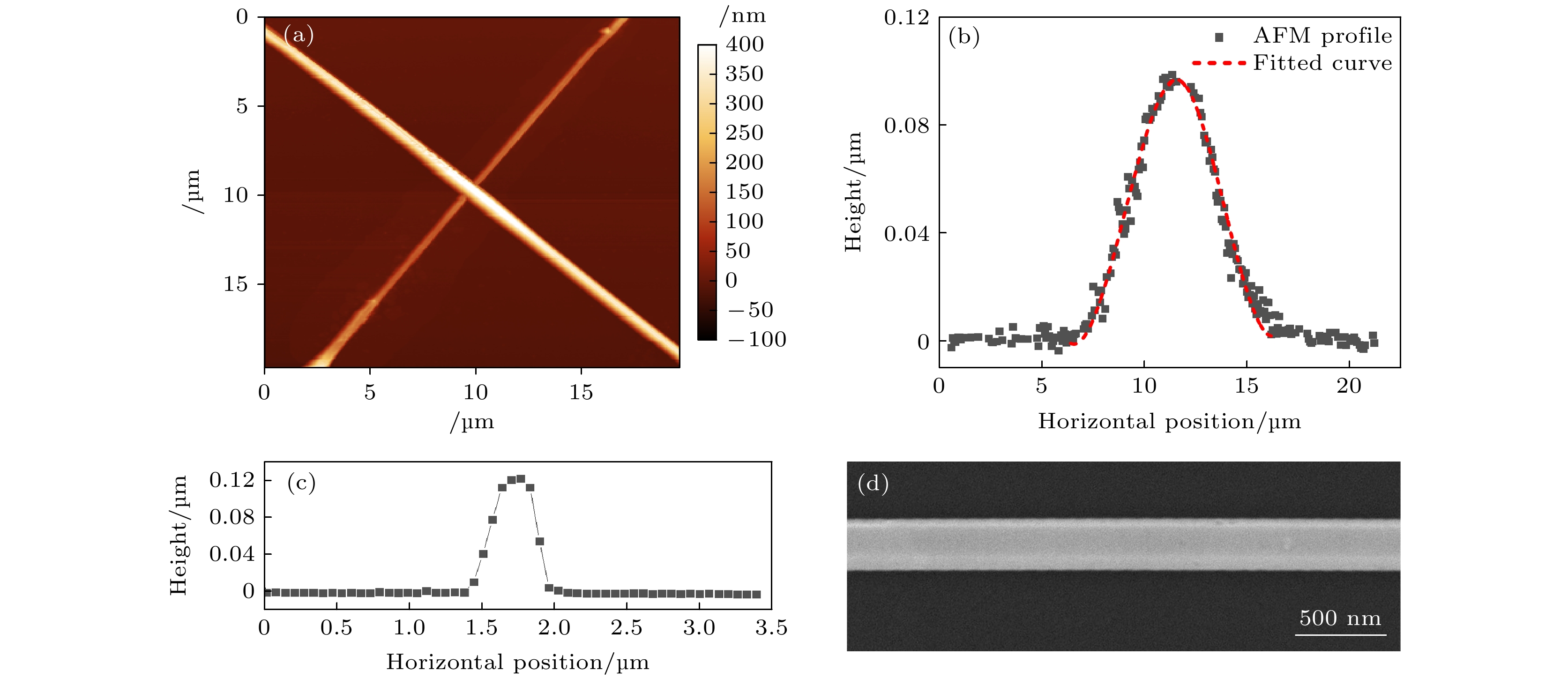 图 6 Si基底上ZnO纳米线拱形 (a) 拱形的低倍AFM照片; (b) 纳米线拱形轮廓的2D AFM照片以及拟合的轮廓曲线; (c) 纳米线横截面的2D AFM照片; (d) 纳米线的高倍SEM图片