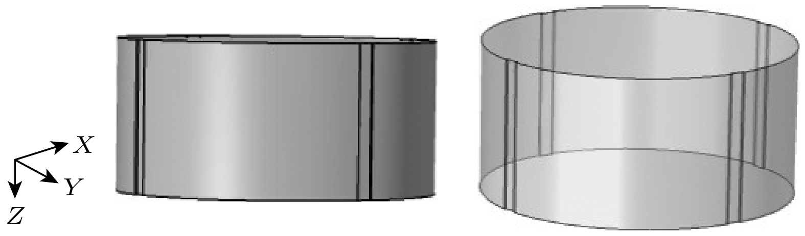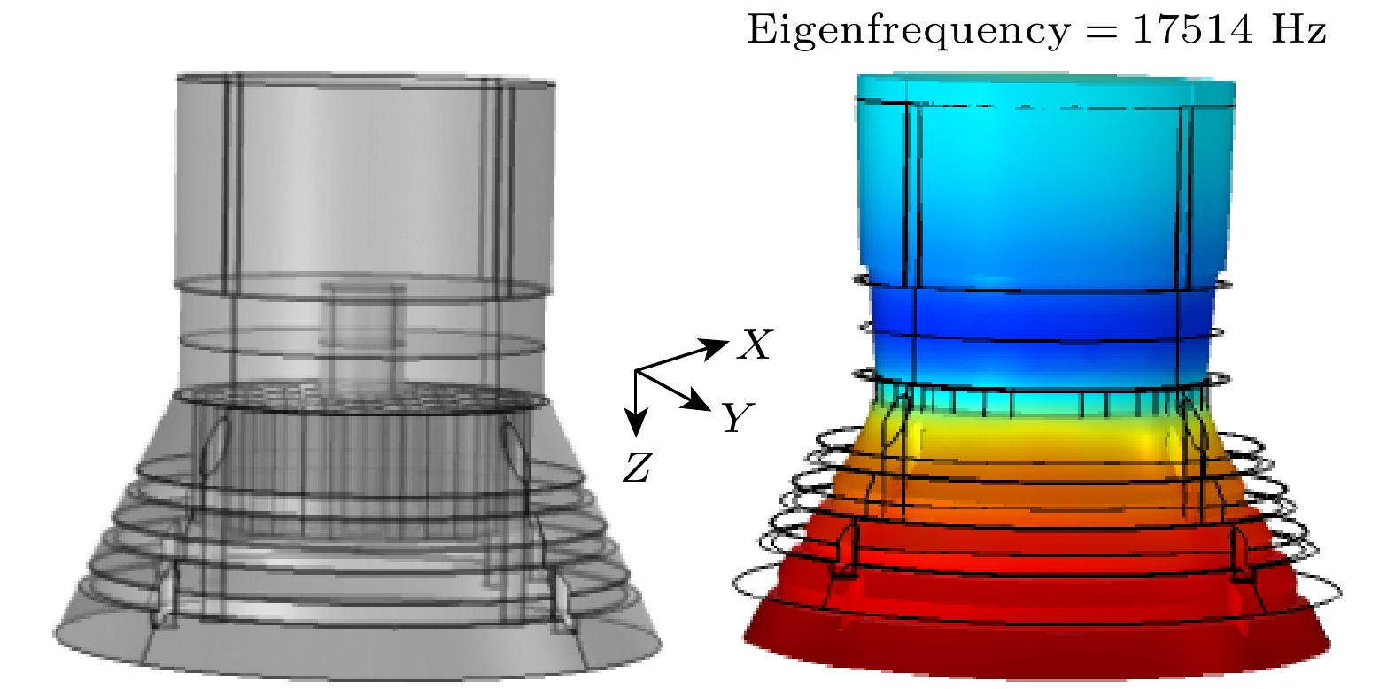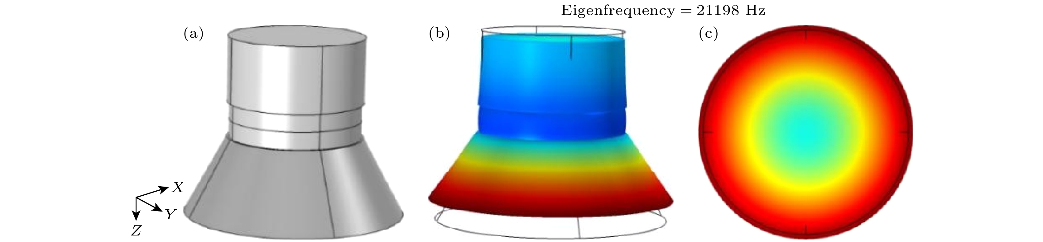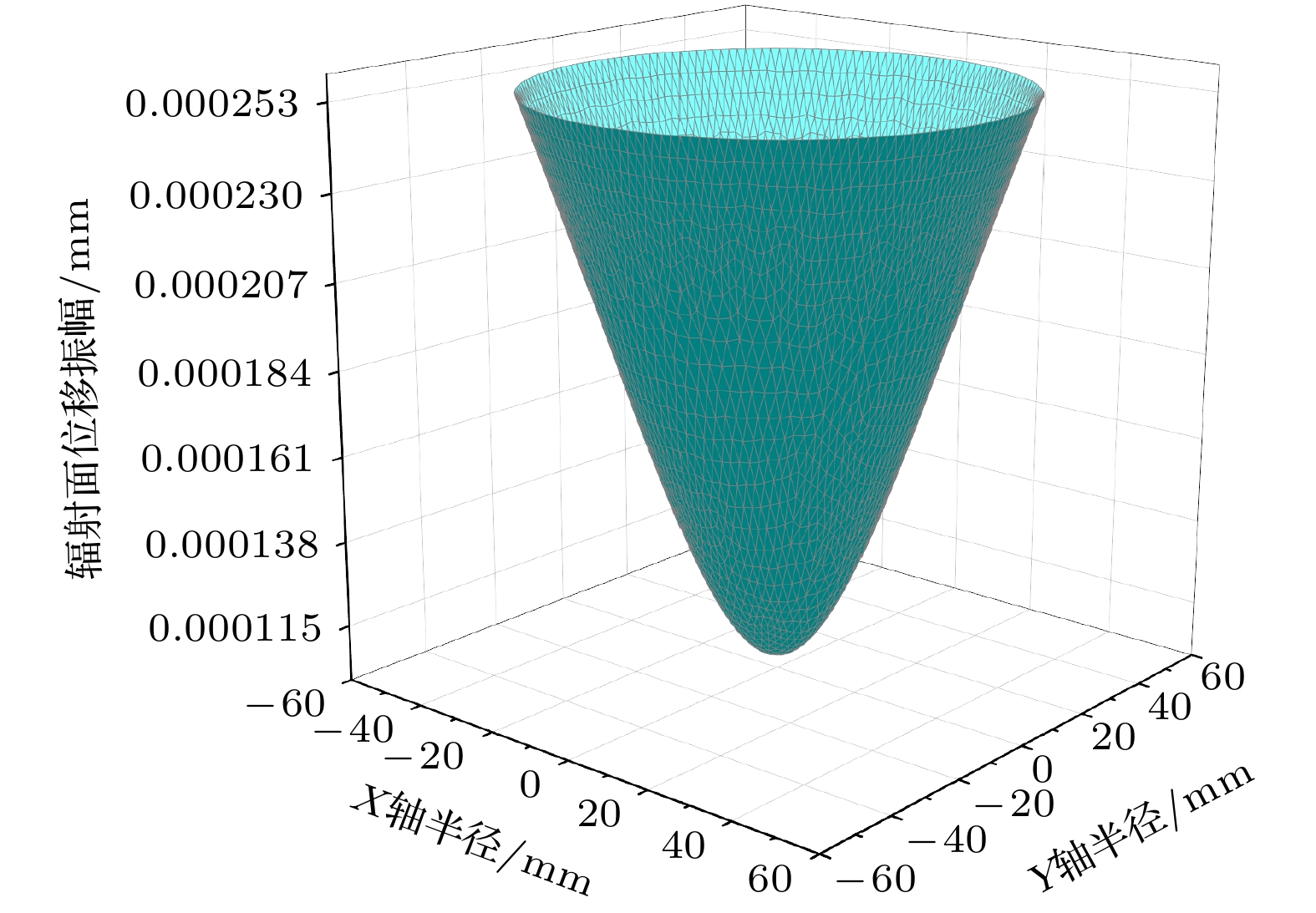 组件名称 材料 形状 上底半径/mm 下底半径/mm 高度/mm 后盖板 Steel AISI 4340 钢 等截面圆柱 31 31 30 前盖板 Aluminium 6063-T83 圆台 31 50 35 压电陶瓷圆环(2片) PZT-4 等截面圆环 内径7/外径30 内径7/外径30 8 A B C D (3)式 x为柱高 19651.327 –277.955 11.400 –0.142 x为柱边长 10141.232 2616.509 –221.630 7.083 x为圆柱体孔半径 17511.585 –3.807 4.071 –0.893 x为环槽高度 17405.221 88.233 –26.829 3.145 x为凹槽厚度 17512.152 4.646 –0.732 0.746×10–1 (4)式 y为圆柱体孔半径 17511.585 –3.807 4.071 –0.893 y为环槽高度 17405.221 88.233 –26.829 3.145 (5)式 y1为表面凹槽厚度 2.909×10–4 8.421×10–6 — — (6)式 z为柱高 41.422 4.051 0.022 –0.454×10–2 z为柱边长 –572.671 386.836 –72.945 4.206 z为圆柱体孔半径 87.149 5.651 –0.866 –0.174 z为环槽的高度 91.649 4.283 –1.871 0.221 -