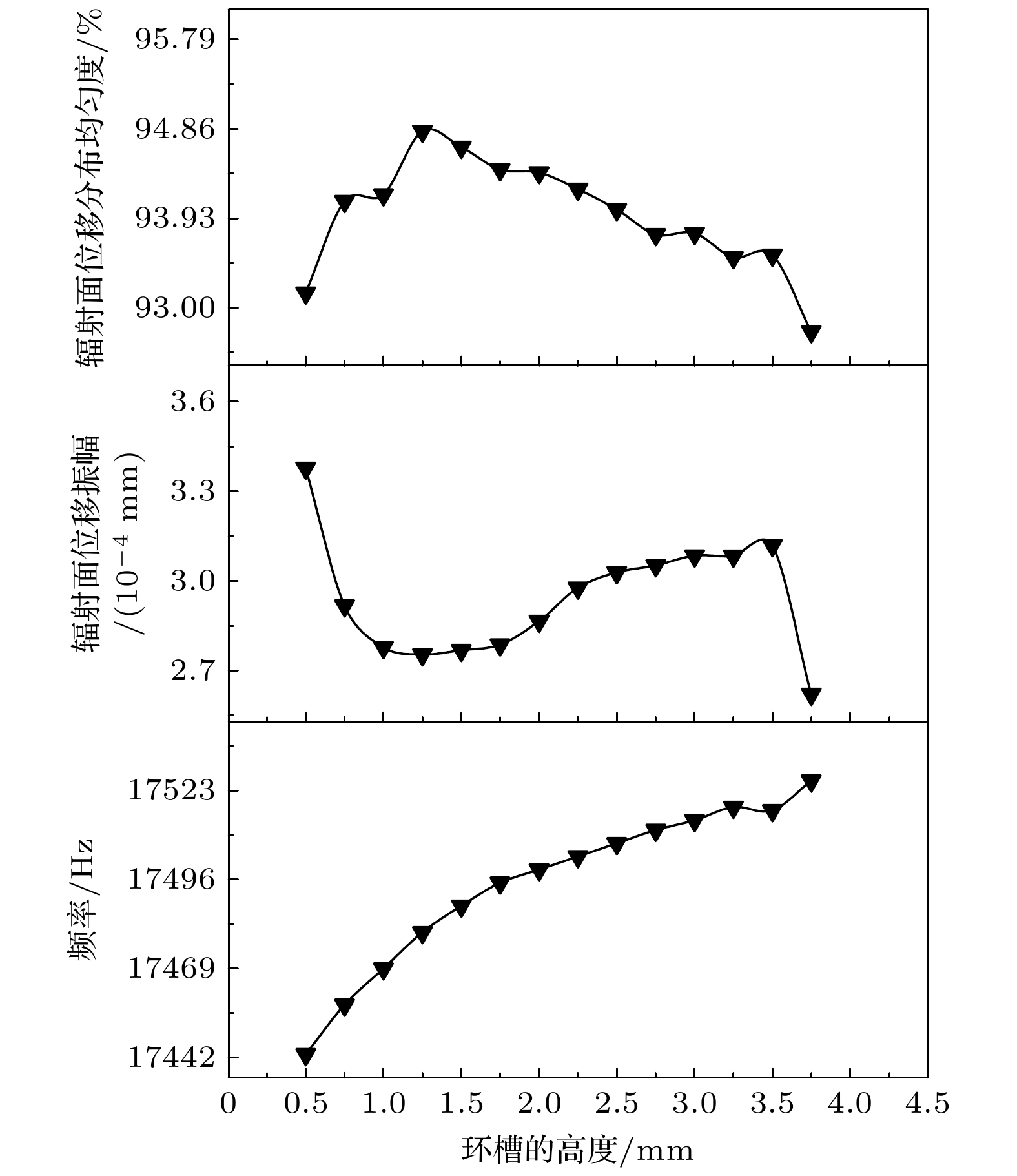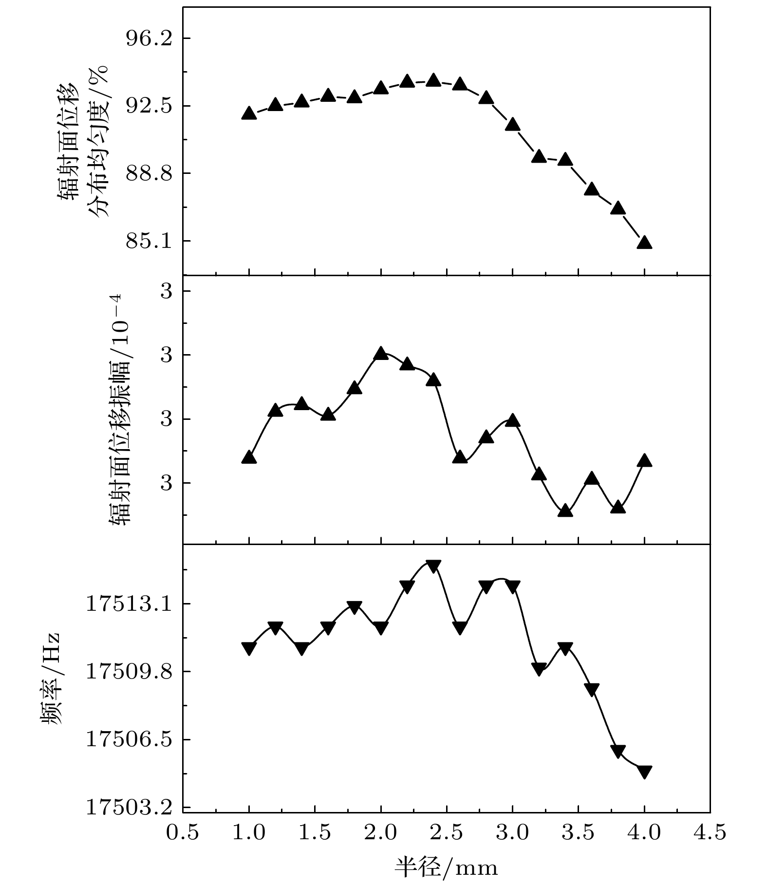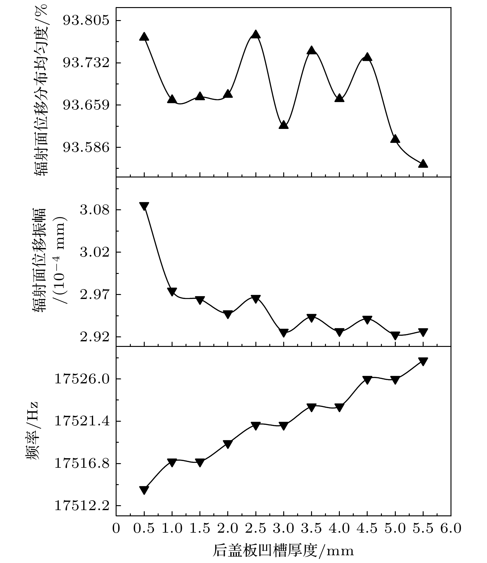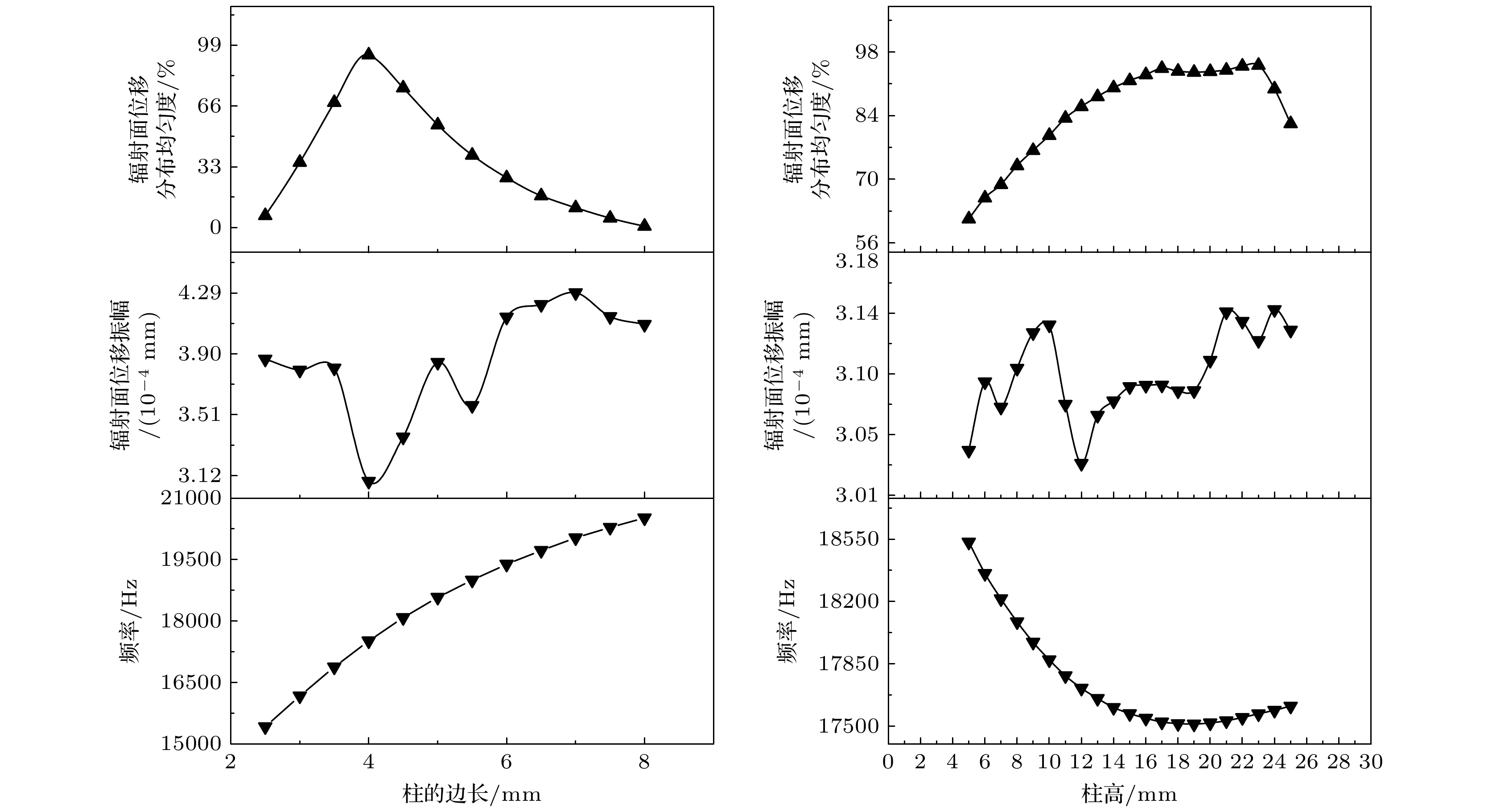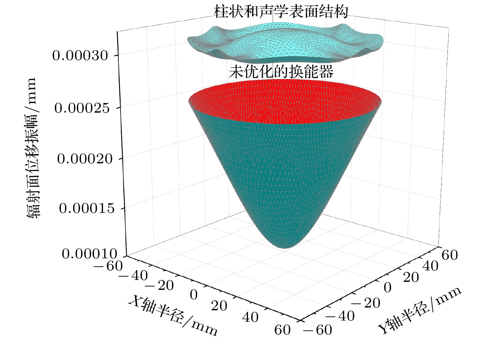 圆孔型声子晶体, 因结构简单、制作方便, 被广泛应用于换能器的性能优化研究. 研究发现, 圆孔型声子晶体结构的孔隙越大, 弹性波的能量局域化效果越好. 但是高孔隙度意味着圆孔间的距离较窄, 会大幅降低结构的机械强度. 柱状声子晶体结构的提出, 解决了圆孔型声子晶体结构需要高孔隙度, 对结构尺寸精度要求高的问题, 为压电超声换能器的性能优化提供了新思路. 利用在换能器的前、后盖板上加工的柱状和声学表面结构, 操控声波的传输行为和路径, 从而实现对换能器中耦合振动的有效控制, 不仅解决了换能器因振动能量不能均匀传递而导致的辐射面振幅分布不均匀的问题, 还使其辐射面的位移振幅得到了显著提升, 提高了换能器的工作效率. 仿真计算结果揭示了柱状和声学表面结构的配置对换能器性能的影响规律, 实验结果证明柱状和声学表面结构可以有效提升压电超声换能器的性能, 研究可以为换能器的工程计算及优化提供系统的设计理论证明.