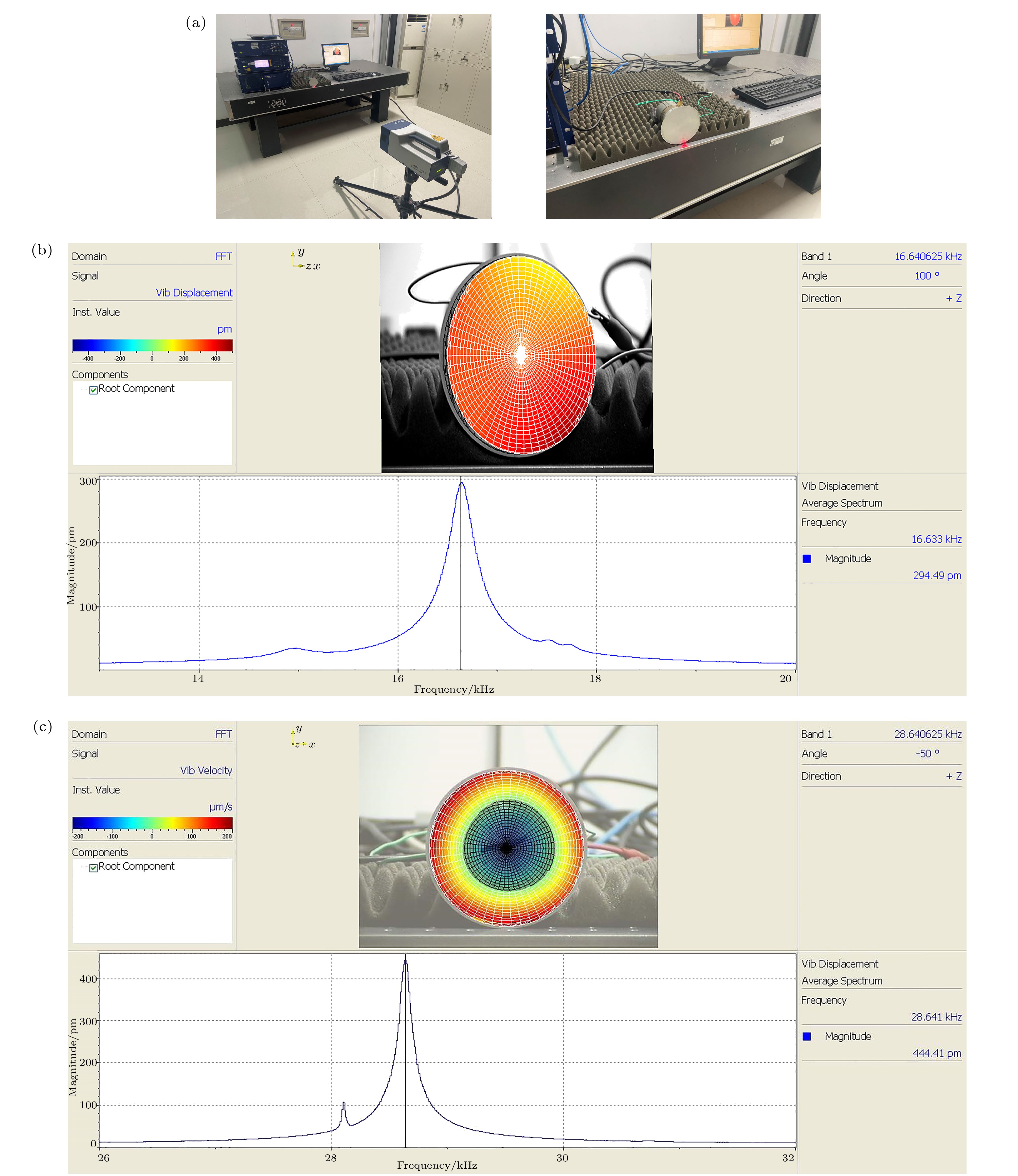 Fig. 15. Experimental measurement of the displacement amplitude distribution of the radiation surface of the transducer: (a) Test chart; (b) measurement results of piezoelectric ultrasonic transducers with columnar and acoustic surface structures; (c) measurement results of the transducer that have not been optimized.