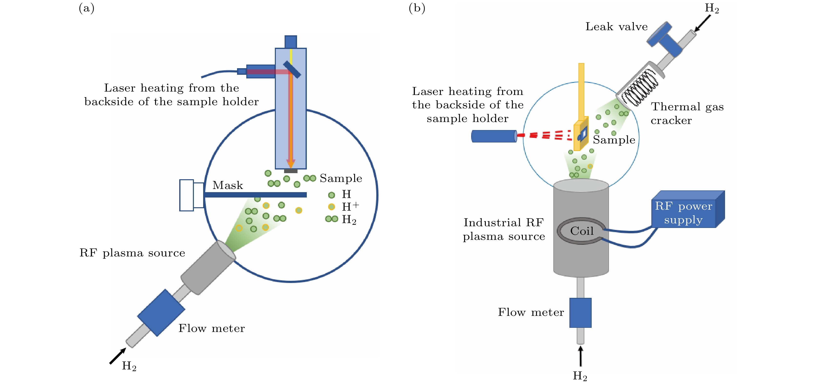 图 1 还原装置示意图 (a) 集成在PLD腔体的科研用射频等离子体源示意图; (b) 集成在另一套腔体的工业用等离子体源和热裂解源示意图