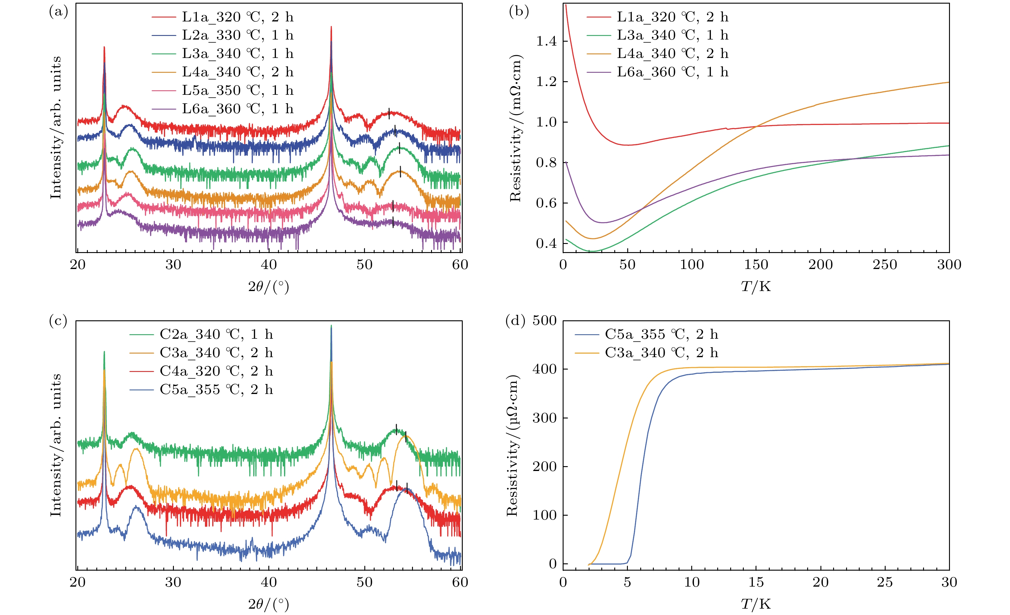 图 2 科研用等离子体源还原条件的优化过程 (a) 采用LaNiO3样品, 固定射频功率为200 W、氢气流量为3 mL/min (标准状态)的条件下, 优化还原温度和还原时长所得的XRD $ \theta \text{—} 2\theta $扫描结果; (b) 与图(a)相同的条件优化结果对应的电阻率-温度曲线, 其中还原条件并非最优的L2a与L5a未进行电阻率-温度的测试, 但图中已经包含更加欠还原的L1a和更加过还原的L6a的电阻数据, 可以反映从最欠还原到最过还原样品的电阻行为的整体演化; (c) 采用La0.8Ca0.2NiO3样品, 固定射频功率为200 W、氢气流量为3 mL/min (标准状态)的条件下, 优化还原温度和还原时长所得的XRD $ \theta \text{—} 2\theta $扫描结果; (d) 科研用等离子体源最优还原条件355 ℃与340 ℃条件下还原的电阻率-温度曲线对比