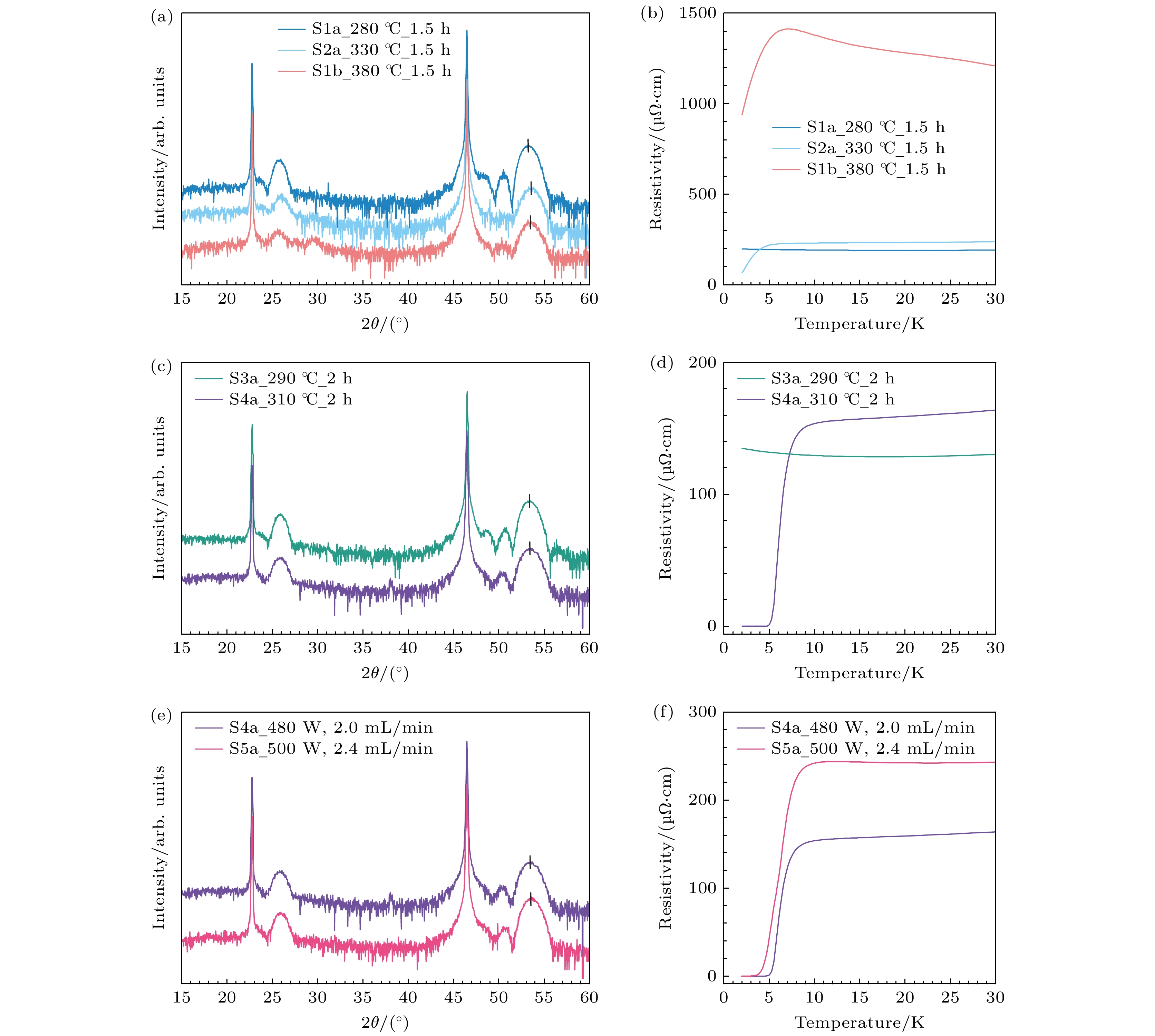 图 3 工业用等离子体源还原条件的优化结果 (a) 在固定射频功率为480 W、氢气流量为2 mL/min (标准状态)、还原时间为1.5 h的条件下, 优化还原温度所得的XRD θ—2θ扫描结果; (b) 与图(a)相同的条件优化结果对应的电阻率-温度曲线; (c) 在延长还原时间至2 h、其余参数不变(射频功率480 W、氢气流量2 mL/min (标准状态))条件下, 进一步优化还原温度所得的XRD θ—2θ扫描结果; (d) 与图(c)相同的条件优化结果对应的电阻率-温度曲线; (e) 在固定样品温度为310 ℃、还原时间为2 h的条件下, 优化射频功率与氢气流量所得的XRD θ—2θ扫描结果; (f) 与图(e)相同的条件优化结果对应的电阻率-温度曲线