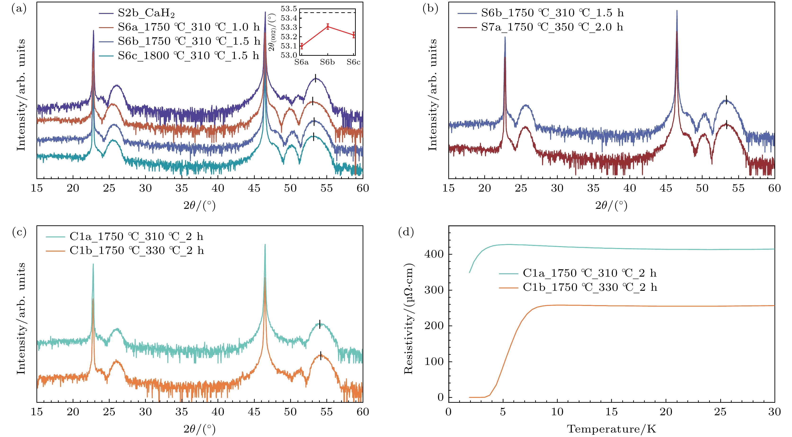 图 4 热裂解源还原条件的优化结果 (a) 在固定样品温度310 ℃、氢气气压1×10–5 mbar的条件下, 优化还原时长和裂解源灯丝温度所得的XRD $ \theta \text{—} 2\theta $扫描结果, 右上角小图为这几块样品的薄膜XRD峰位对比, 虚线标示出CaH2还原的薄膜XRD峰位, 即期望的112相薄膜峰位; (b) 在固定氢气气压$ {1\times10}^{{-5}} $ mbar、裂解源灯丝温度1750 ℃的条件下, 优化样品温度和还原时长所得的 XRD $ \theta \text{—} 2\theta $扫描结果; (c) 在固定氢气气压$ 3\times10^{{-5}} $ mbar、裂解源灯丝温度1750 ℃、还原时长2 h的条件下, 进一步优化样品温度所得的 XRD $ \theta \text{—} 2\theta $扫描结果; (d) 与图(c)相同的条件优化结果对应的电阻率-温度曲线