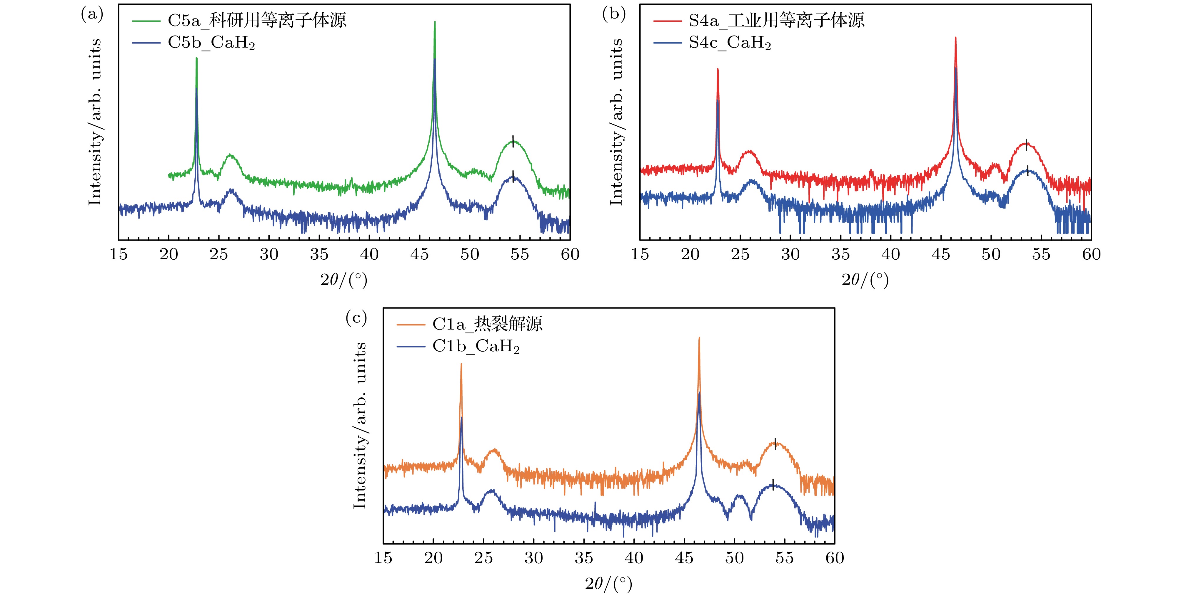 图 5 3种原子氢产生方式的最优还原条件下, 与CaH2还原样品的XRD $ \theta \text{—} 2\theta $结果对比 (a) 科研用等离子体源最优还原条件与CaH2还原样品XRD的$ \theta\text{—} 2\theta $扫描结果对比; (b) 工业用等离子体源最优还原条件与CaH2还原样品XRD的$ \theta \text{—} 2\theta $扫描结果对比; (c) 热裂解源最优还原条件与CaH2还原样品XRD的$ \theta \text{—} 2\theta $扫描结果对比