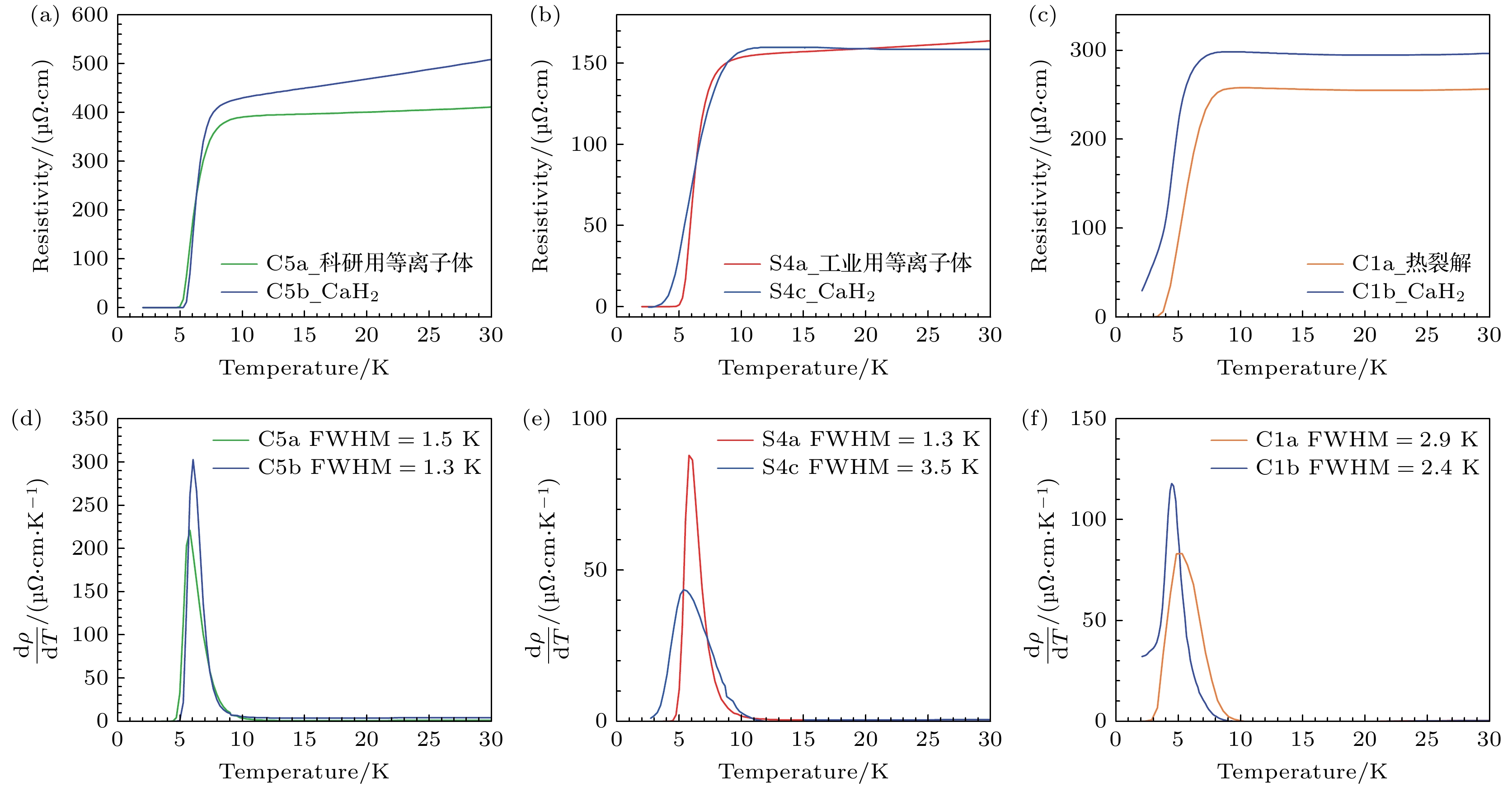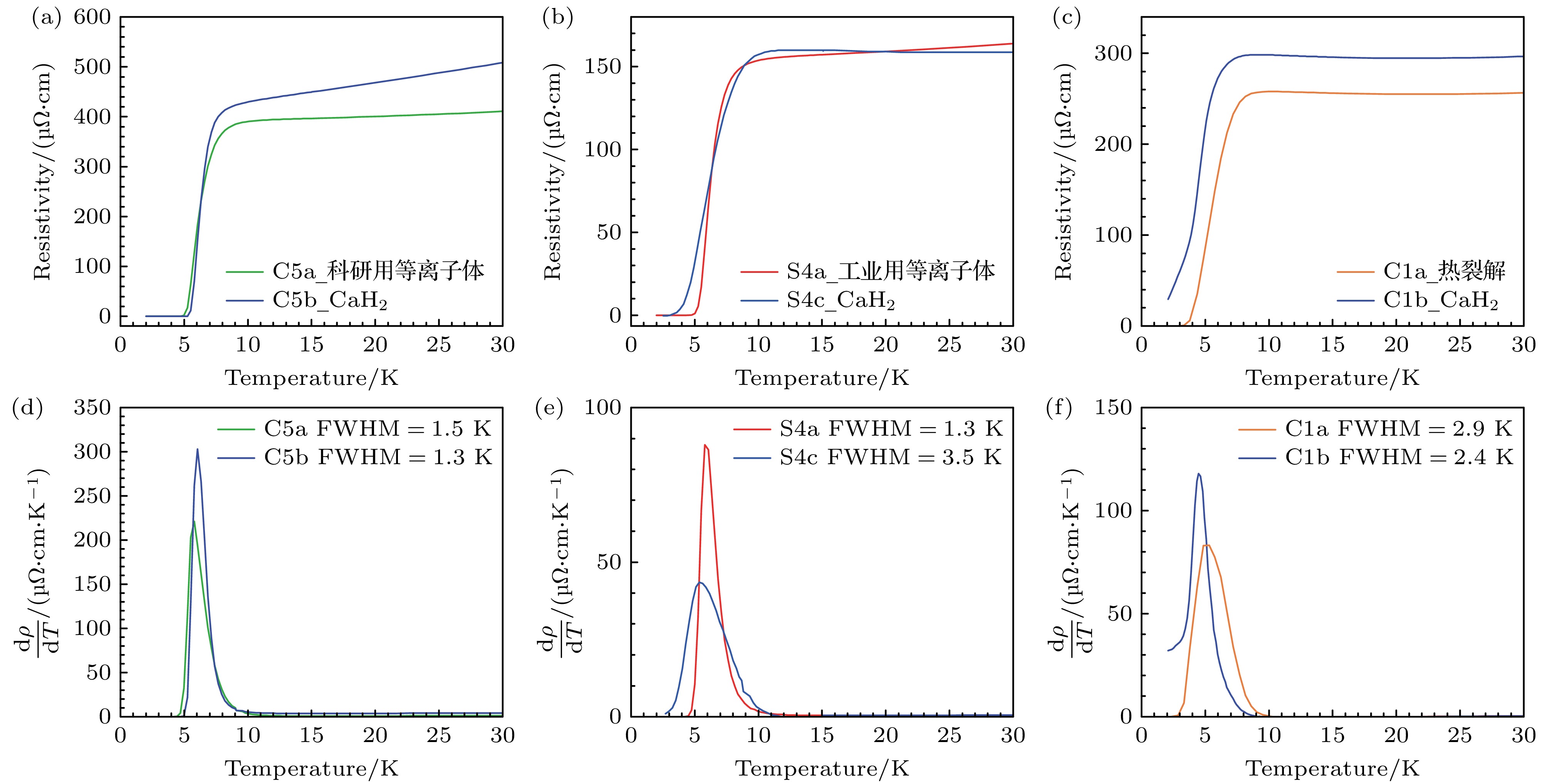 图 6 3种原子氢产生方式的最优还原条件下, 与CaH2还原同一块前驱体样品的电阻率-温度曲线比较 (a) 科研用射频等离子体源下的电阻率-温度曲线; (b) 工业用等离子体源下的电阻率-温度曲线; (c) 热裂解源下的电阻率-温度曲线; (d) 图(a)中电阻率-温度曲线对温度的一阶导数; (e) 图(b)中电阻率-温度曲线对温度的一阶导数; (f) 图(c)中电阻率-温度曲线对温度的一阶导数