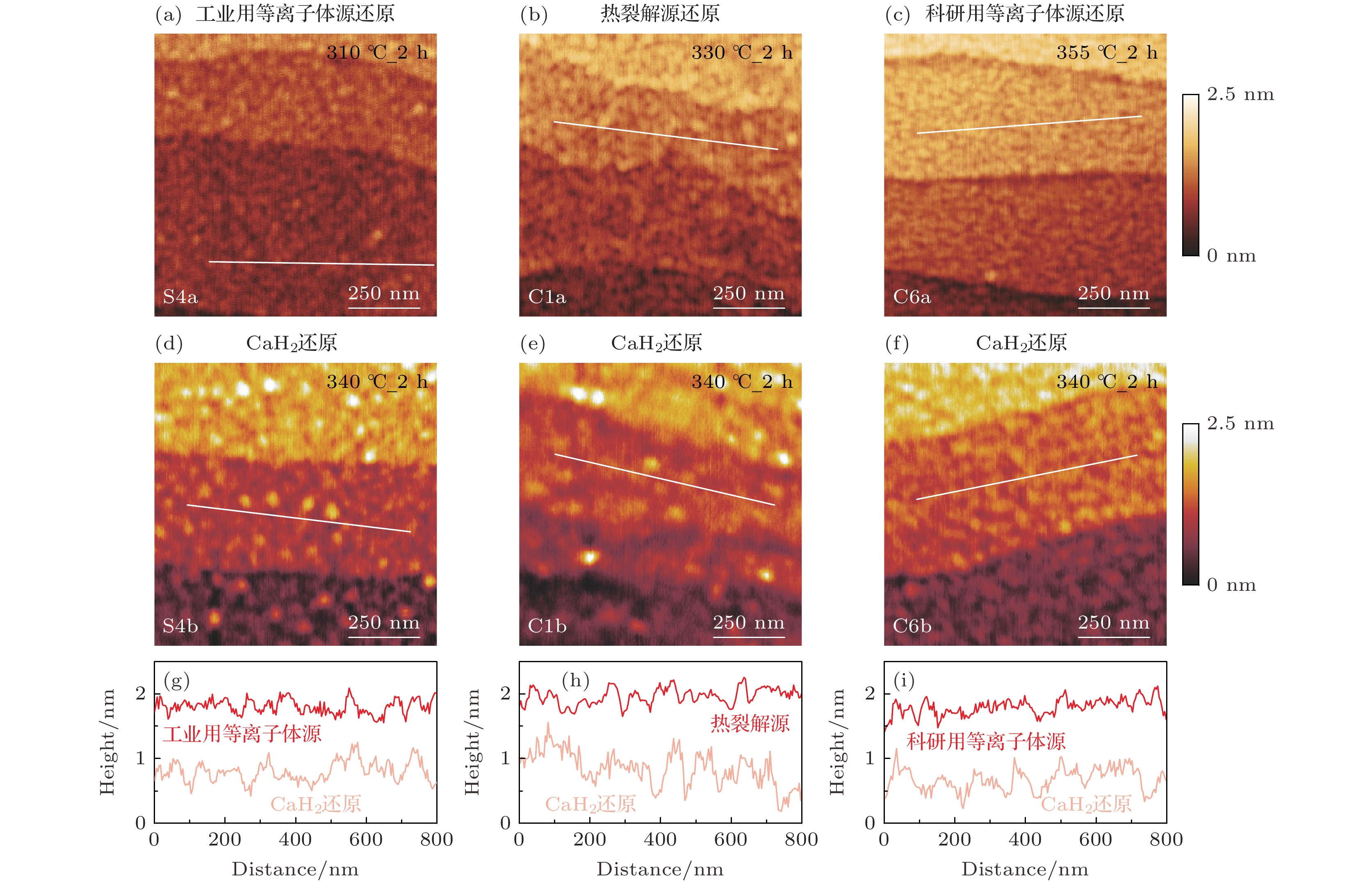Fig. 7. AFM surface morphology comparison of samples reduced under optimal conditions using three atomic hydrogen sources and CaH2. (a)–(c) AFM surface morphology of samples reduced under the optimal conditions of three atomic hydrogen sources; (d)–(f) Morphology of the corresponding precursor samples reduced by CaH2 for comparison (scale bar: 250 nm). (g)–(i) Height profile comparisons along representative line scans taken from panels (a), (d), (b), (e), and (c), (f), respectively. For clarity, the curves have been vertically shifted.