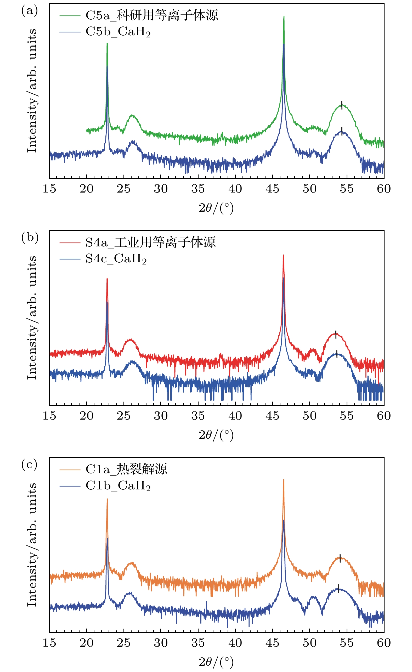 图 5 3种原子氢产生方式的最优还原条件下, 与CaH2还原样品的XRD $ \theta $-$ 2\theta $结果对比 (a) 科研用等离子体源最优还原条件与CaH2还原样品XRD的$ \theta $-$ 2\theta $扫描结果对比; (b) 工业用等离子体源最优还原条件与CaH2还原样品XRD的$ \theta $-$ 2\theta $扫描结果对比; (c) 热裂解源最优还原条件与CaH2还原样品XRD的$ \theta $-$ 2\theta $扫描结果对比
