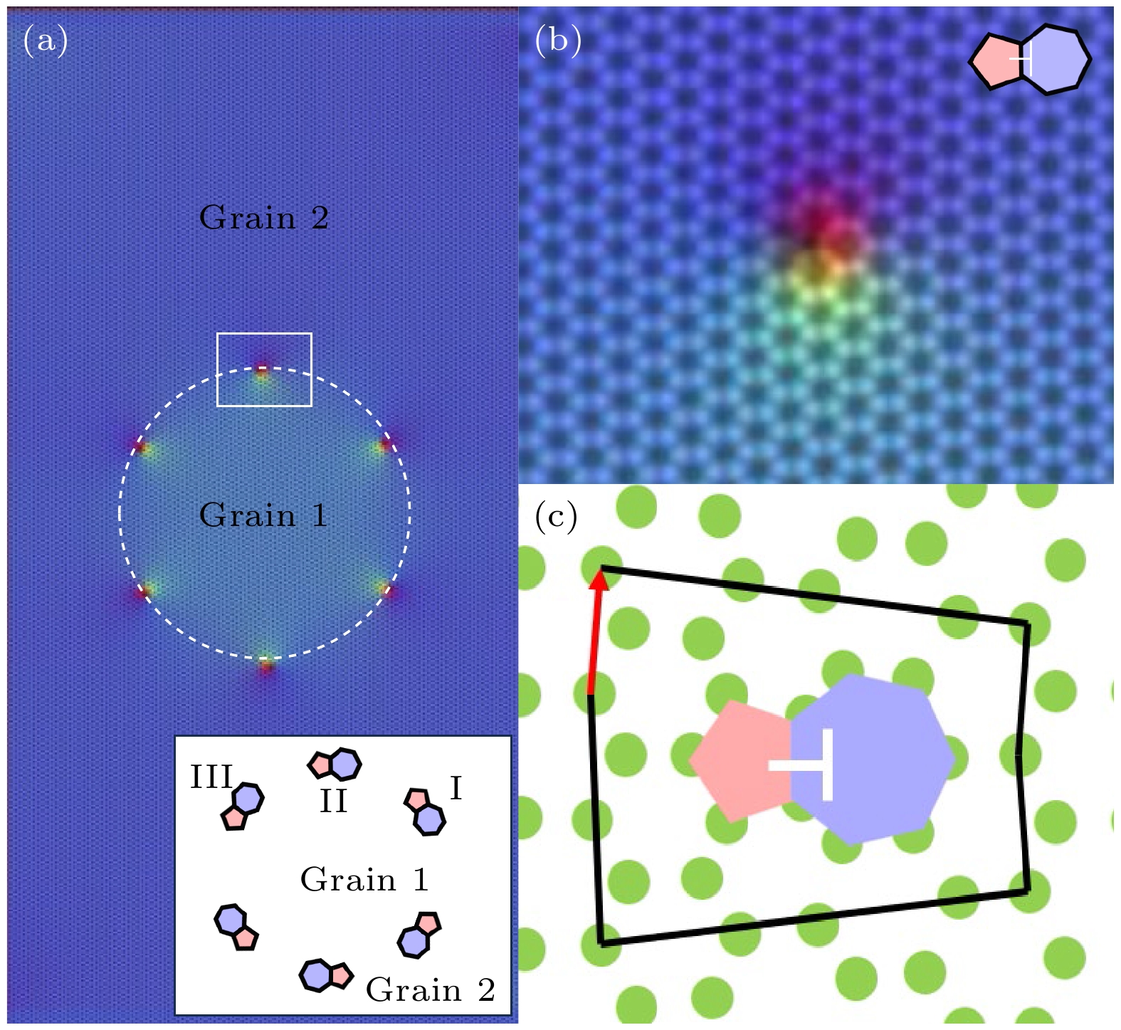 Fig. 1. Structure of graphene bicrystal system containing a grain boundary (GB) loop: (a) Illustration of lattice orientation in the graphene bicrystal system, with the inset showing the arrangement of 5|7 dislocations at the GB loop; (b) magnified view of the rectangular region in panel (a); (c) atomic structure diagram of the 5|7 dislocation in panel (b) and its Burgers vector (indicated by the red arrow).