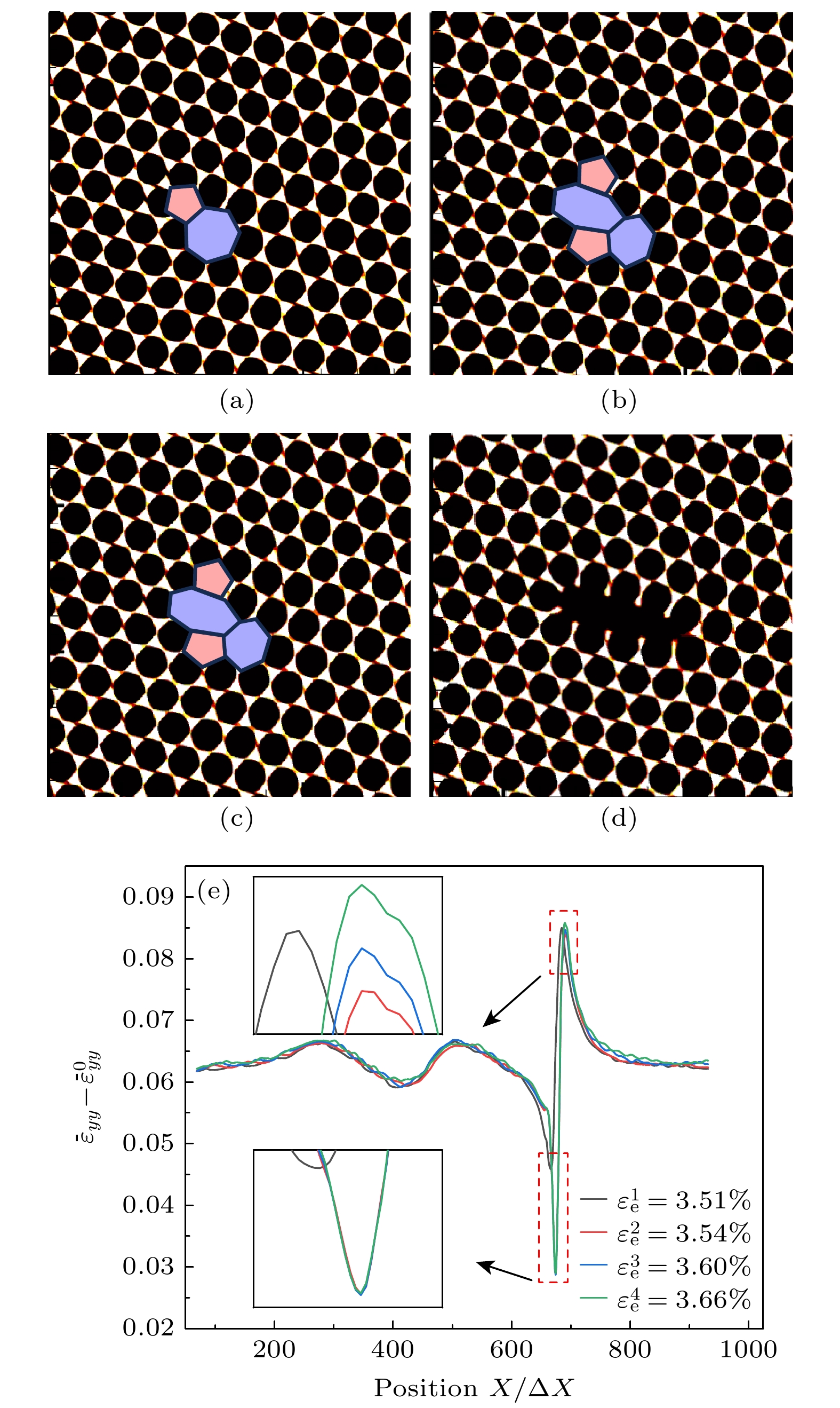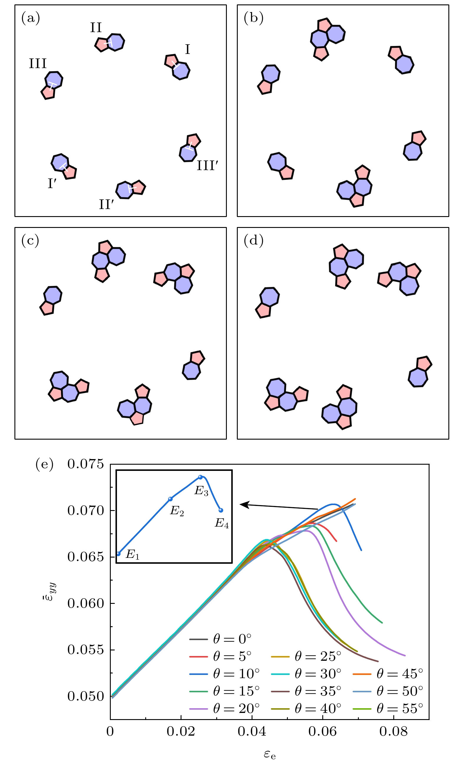图 3 石墨烯双晶体系晶界环拓扑结构演化过程示意图, 其中(a)—(d) ${\varepsilon _{\text{e}}}$= 0.59%, 3.25%, 3.72%, 4.19%; (e) 12组不同晶体取向石墨烯双晶体系的平均响应应变${\bar \varepsilon _{yy}}$-外加应变${\varepsilon _{\text{e}}}$响应曲线