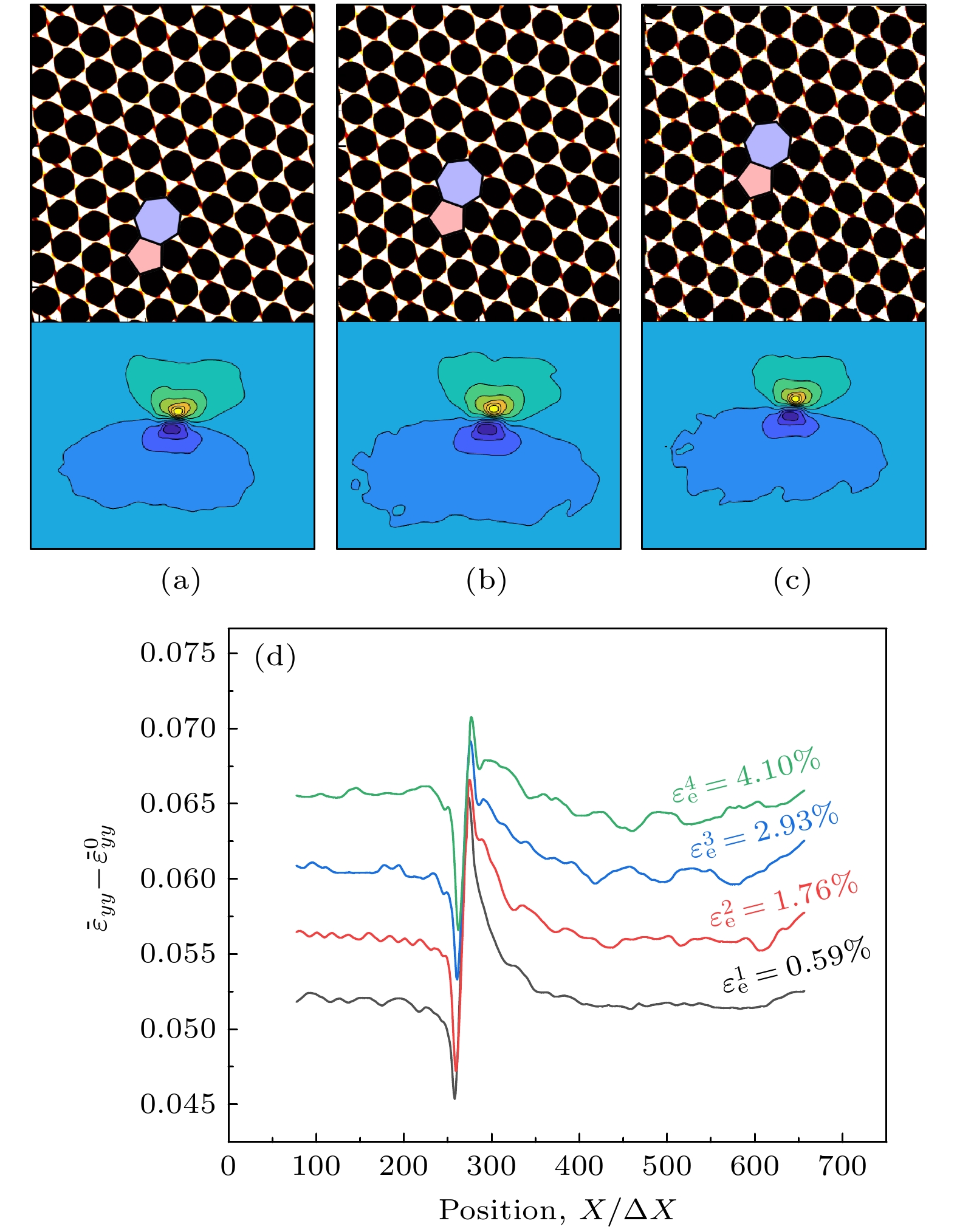 图 11 双晶体系3, 晶界环III号位错($\alpha $ = 70.7°)在应变作用下的微观结构图与应变响应过程 (a)—(c) ${\varepsilon _{\text{e}}}$ = 0.59%, 1.76%, 2.93%; (d) 所对应的位错核心处的平均局部应变(${\bar \varepsilon _{yy}} - \bar \varepsilon _{yy}^0$)-外加应变${\varepsilon _{\text{e}}}$响应曲线