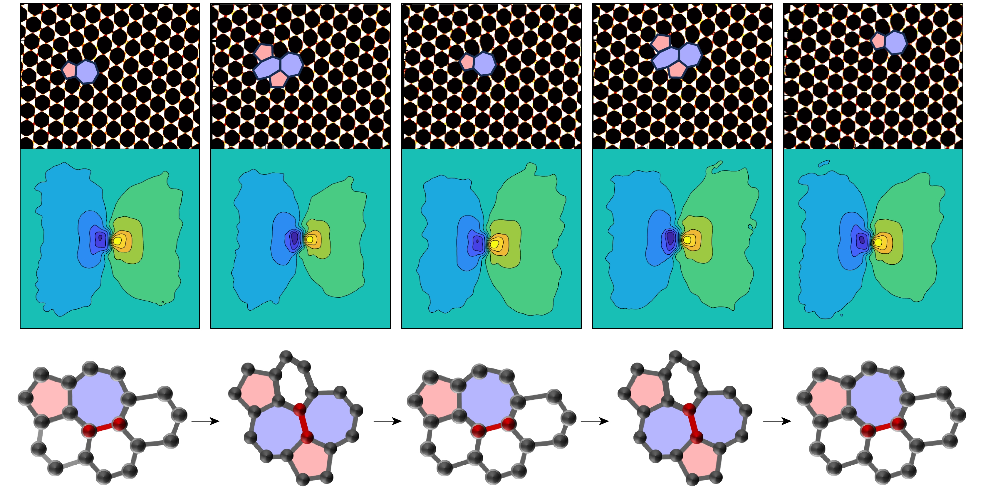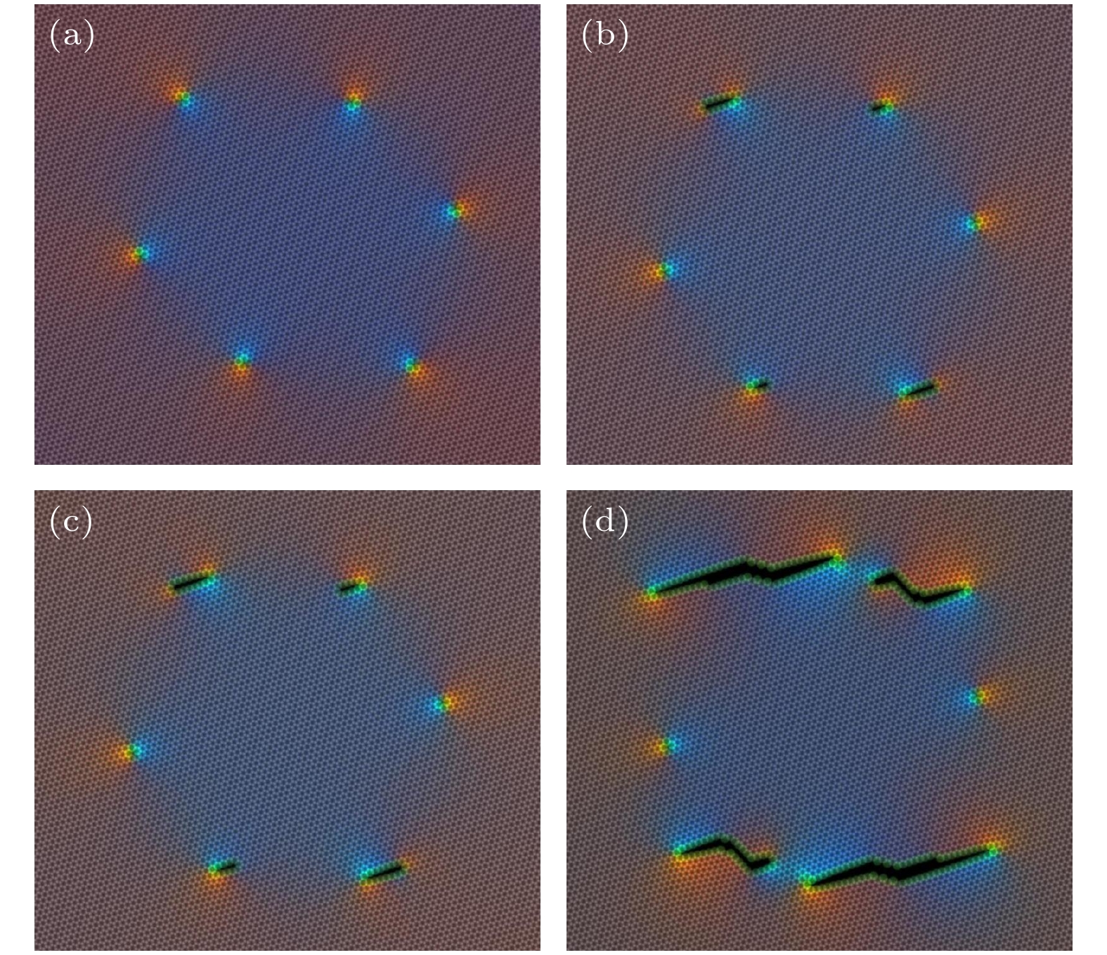 石墨烯晶界结构的演化规律及其位错运动机制的研究对理解石墨烯的塑性变形行为具有重要意义, 目前对于在非机械作用下石墨烯晶界的动力学行为已得到广泛研究, 但由于已有实验条件和模拟方法在时间和空间尺度方面的限制, 关于机械拉伸载荷作用下石墨烯位错动态演化过程及塑性变形问题仍知之甚少. 本文基于晶体相场模型, 研究了在单轴拉伸载荷作用下石墨烯晶界环的动力学演化过程. 模拟研究结果表明, 当外加应变低于临界值时, 石墨烯体系处于弹性响应阶段, 5|7位错核心区域的应变振幅随着外加载荷的增大而减小; 而当应变达到临界值时, 体系发生弹-塑性转变, 晶界环处5|7位错通过C—C键旋转, 转变为5|7|7|5位错, 此时位错核心区域的应变振幅增大, 标志着体系塑性变形的启动; 当应变超过临界值后, 体系进入塑性变形阶段, 晶界环呈现出3种特征性演化行为: 5|7位错与5|7|7|5位错之间发生缺陷结构交替转变; 位错经历“钉扎$\rightleftharpoons $攀移/滑移混合运动”的反复演化过程; 位错保持“钉扎”状态直至位错处裂纹形核并发生韧性断裂. 本工作为深入理解石墨烯塑性变形行为提供了重要理论基础.