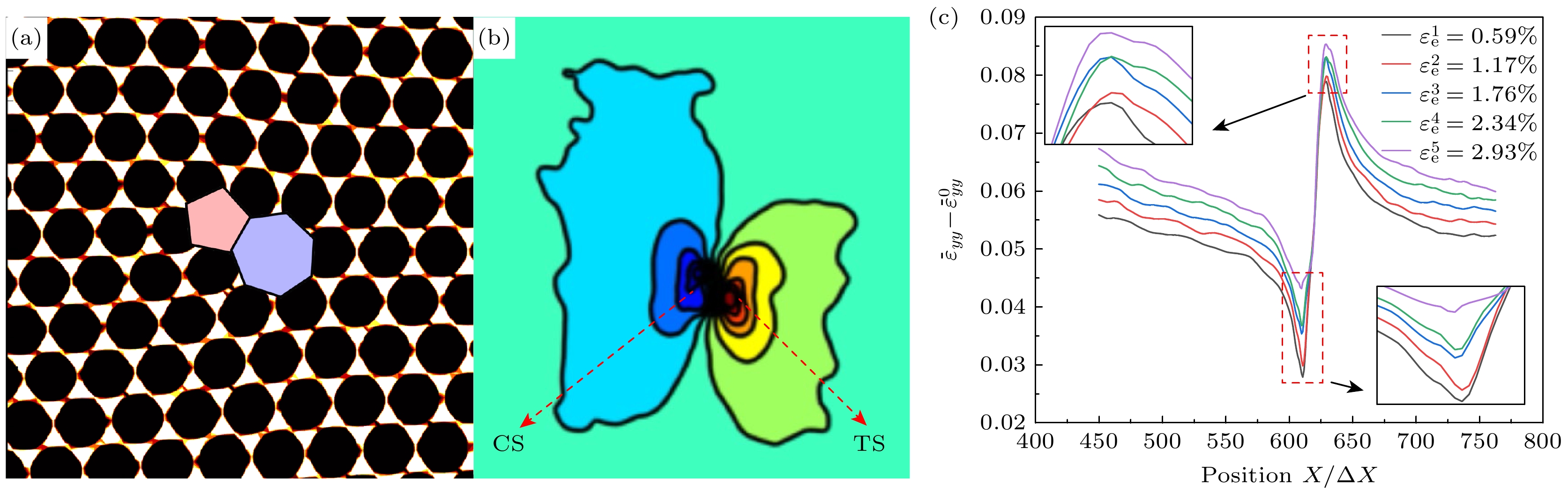 图 4 双晶体系7中晶界环I号位错($\alpha $= 29.5°)在应变作用下的弹性响应过程 (a) 5|7位错微观结构图; (b) 图(a)的局部应变分布云图及压缩应变(CS)值和拉伸应变(TS)值; (c) 5|7位错核心处的平均局部应变(${\bar \varepsilon _{yy}} - \bar \varepsilon _{yy}^0$)-外加应变${\varepsilon _{\text{e}}}$响应曲线
