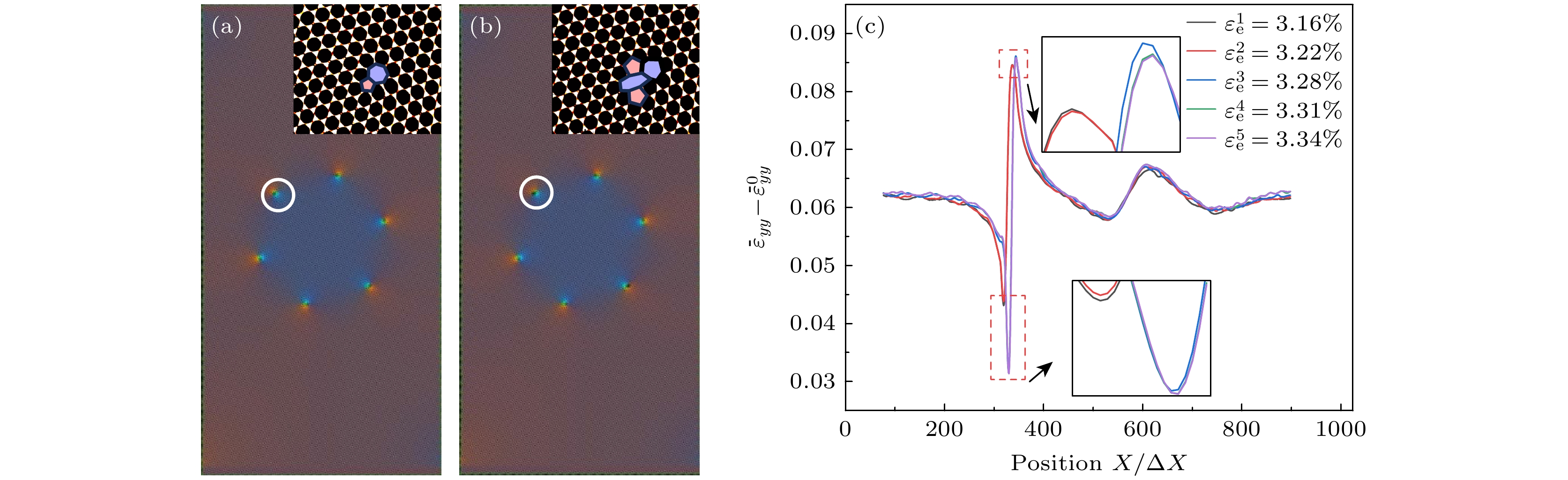 图 6 双晶体系10, 晶界环II号位错($\alpha $= 45.3°)结构转变图, 其中(a) ${\varepsilon _{\text{e}}}$= 3.22%, (b) ${\varepsilon _{\text{e}}}$= 3.28%; (c) 弹-塑性转变过程的平均局部应变(${\bar \varepsilon _{yy}} - \bar \varepsilon _{yy}^0$)-外加应变${\varepsilon _{\text{e}}}$响应曲线
