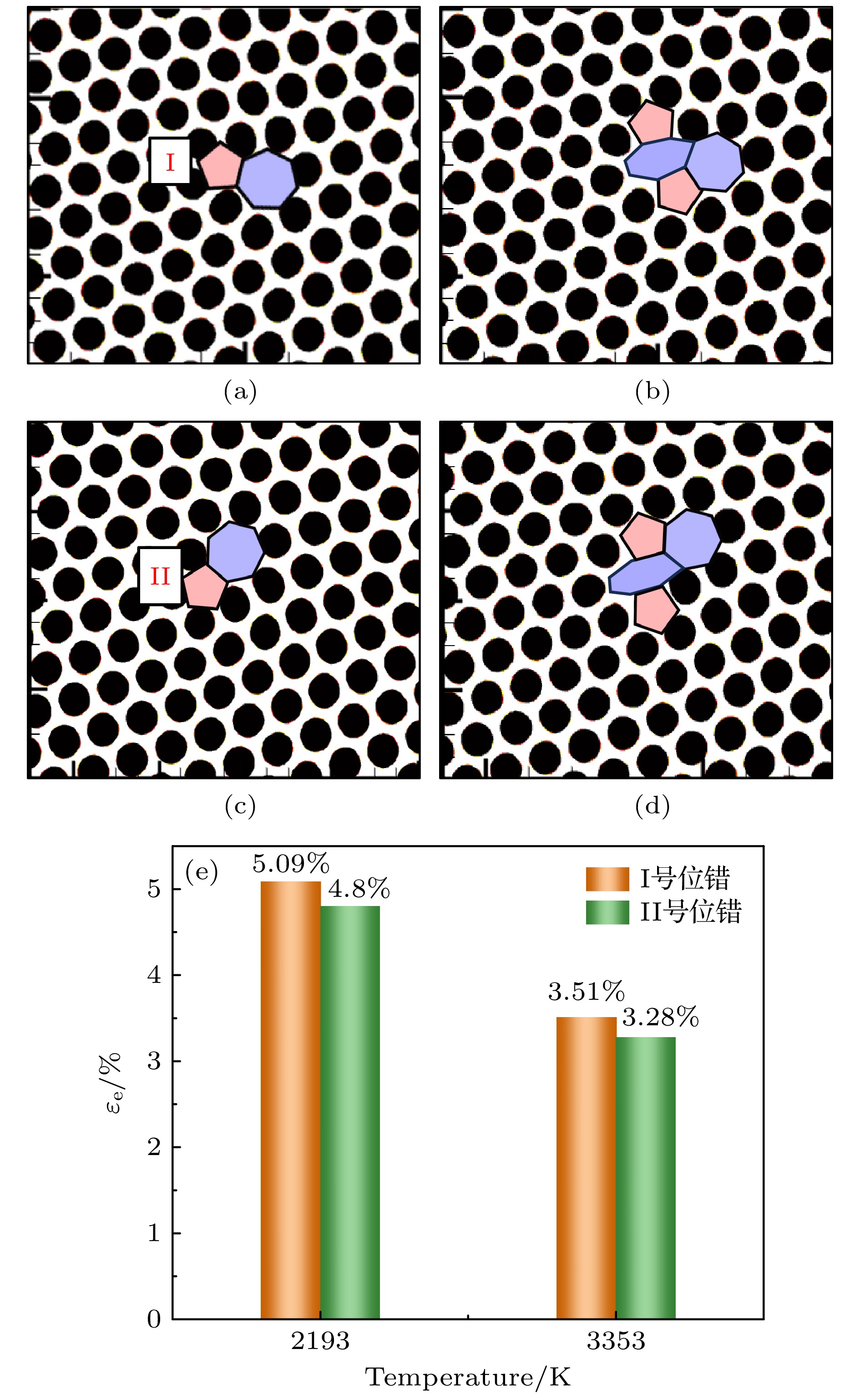 图 10 双晶体系4, 晶界环I号位错($\alpha $ = 44.5°)在应变作用下的微观结构演化图与应变响应过程 (a)—(d) ${\varepsilon _{\text{e}}}$ = 3.51%, 3.54%, 3.60%, 4.19%; (e) 所对应的位错核心处的平均局部应变(${\bar \varepsilon _{yy}} - \bar \varepsilon _{yy}^0$)-外加应变${\varepsilon _{\text{e}}}$响应曲线