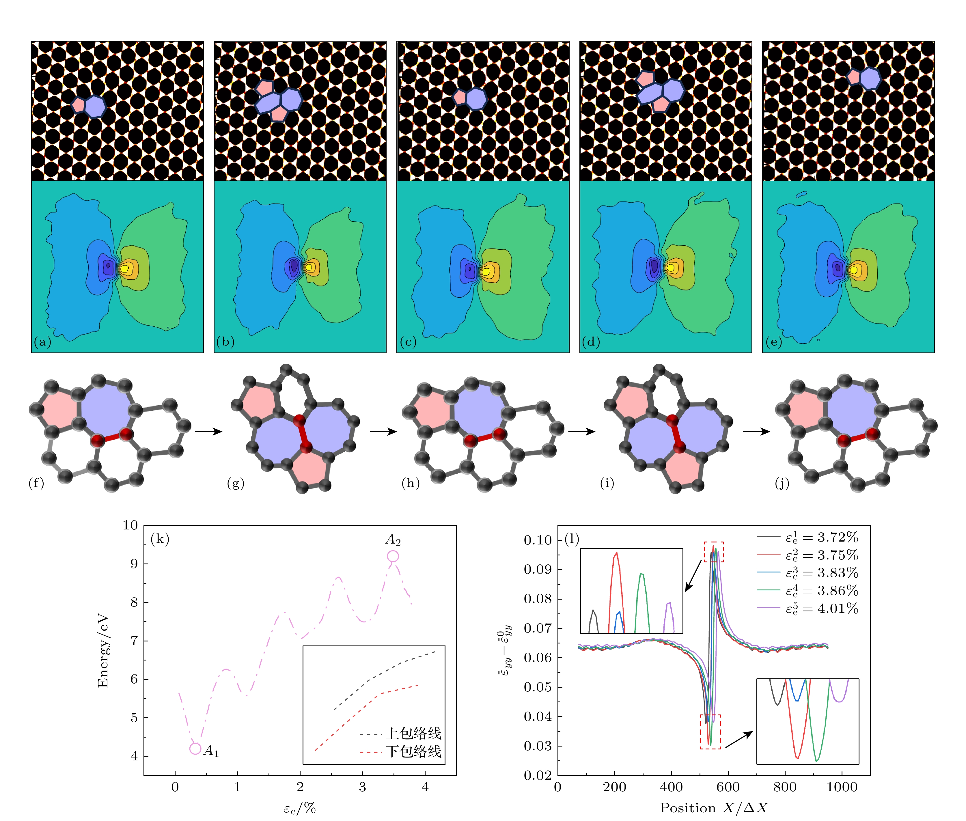 图 8 双晶体系12, 晶界环I号位错($\alpha $ = 4.5°)在应变作用下的微观结构演化图与应变响应过程 (a)—(e) 位错缺陷结构微观演化图及其所对应的位错核心区域的应变等值线图(${\varepsilon _{\text{e}}}$ = 3.72%, 3.75%, 3.83%, 3.86%, 4.01%); (f)—(j)为对应的演化过程示意图; (k) I号位错的局部能量密度均值-外加应变曲线; (l) 位错核心处的平均局部应变(${\bar \varepsilon _{yy}} - \bar \varepsilon _{yy}^0$)-外加应变${\varepsilon _{\text{e}}}$响应曲线