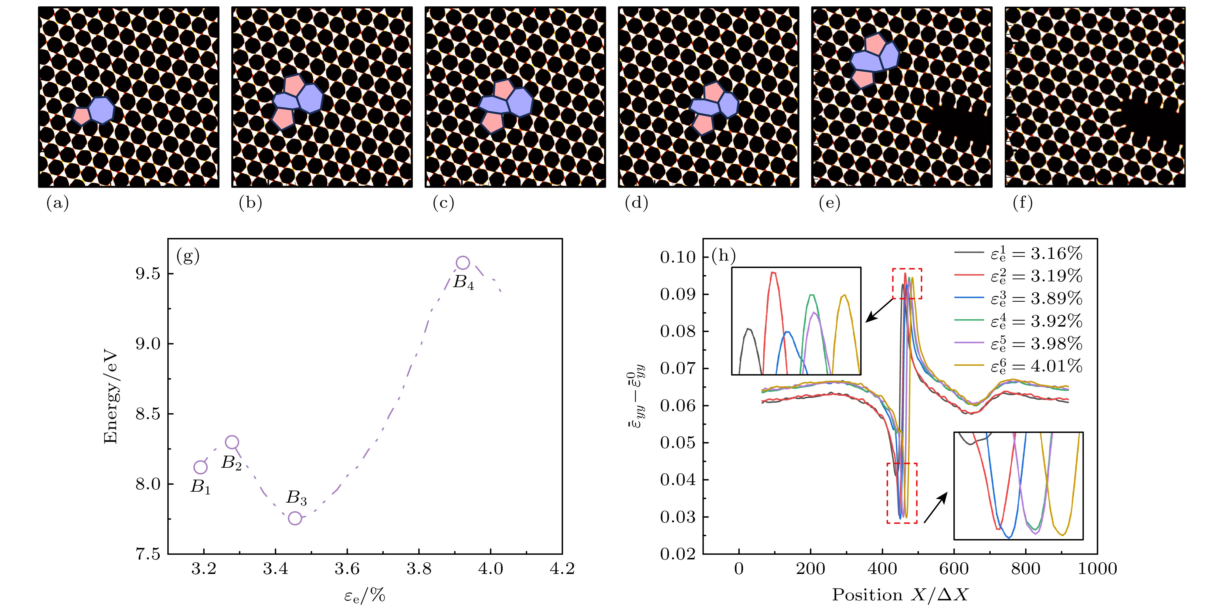 图 9 双晶体系4, 晶界环II号位错($\alpha $ = 15.3°)在应变作用下的微观结构演化图与应变响应过程 (a)—(f) ${\varepsilon _{\text{e}}}$ = 3.16%, 3.19%, 3.89%, 3.92%, 3.98%, 4.01%; (g) II号位错的局部能量密度均值-外加应变曲线; (h) 位错核心处的平均局部应变(${\bar \varepsilon _{yy}} - \bar \varepsilon _{yy}^0$)-外加应变${\varepsilon _{\text{e}}}$响应曲线