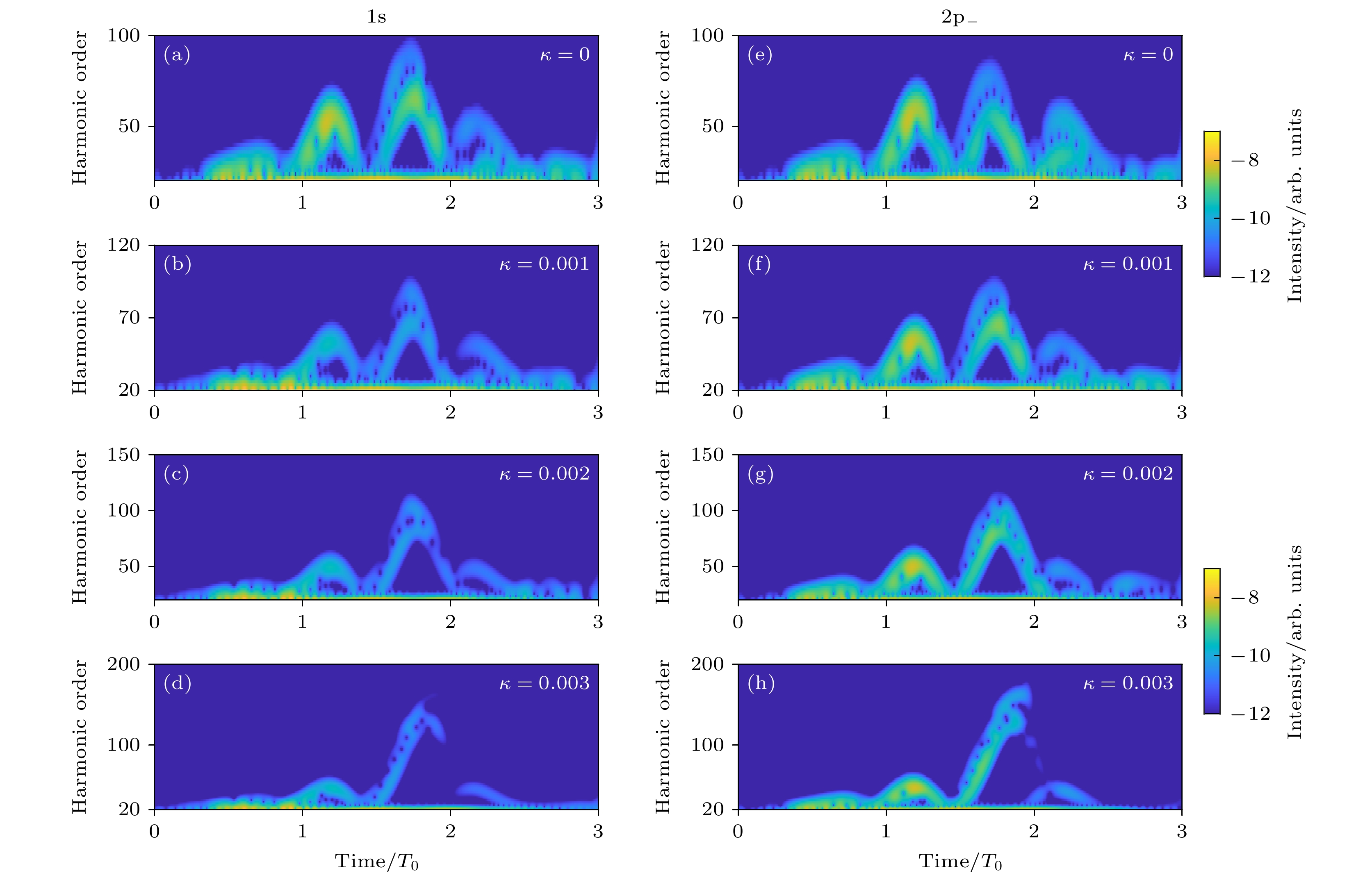 图 3 高次谐波的时频分析图 (a) $ \kappa $ = 0, 1s轨道; (b) $ \kappa $ = 0.001, 1s轨道; (c) $ \kappa $ = 0.002, 1s轨道; (d) $ \kappa $ = 0.003, 1s轨道; (e) $ \kappa $ = 0, 2p-轨道; (f) $ \kappa $ = 0.001, 2p-轨道; (g) $ \kappa $ = 0.002, 2p-轨道; (h) $ \kappa $ = 0.003, 2p-轨道