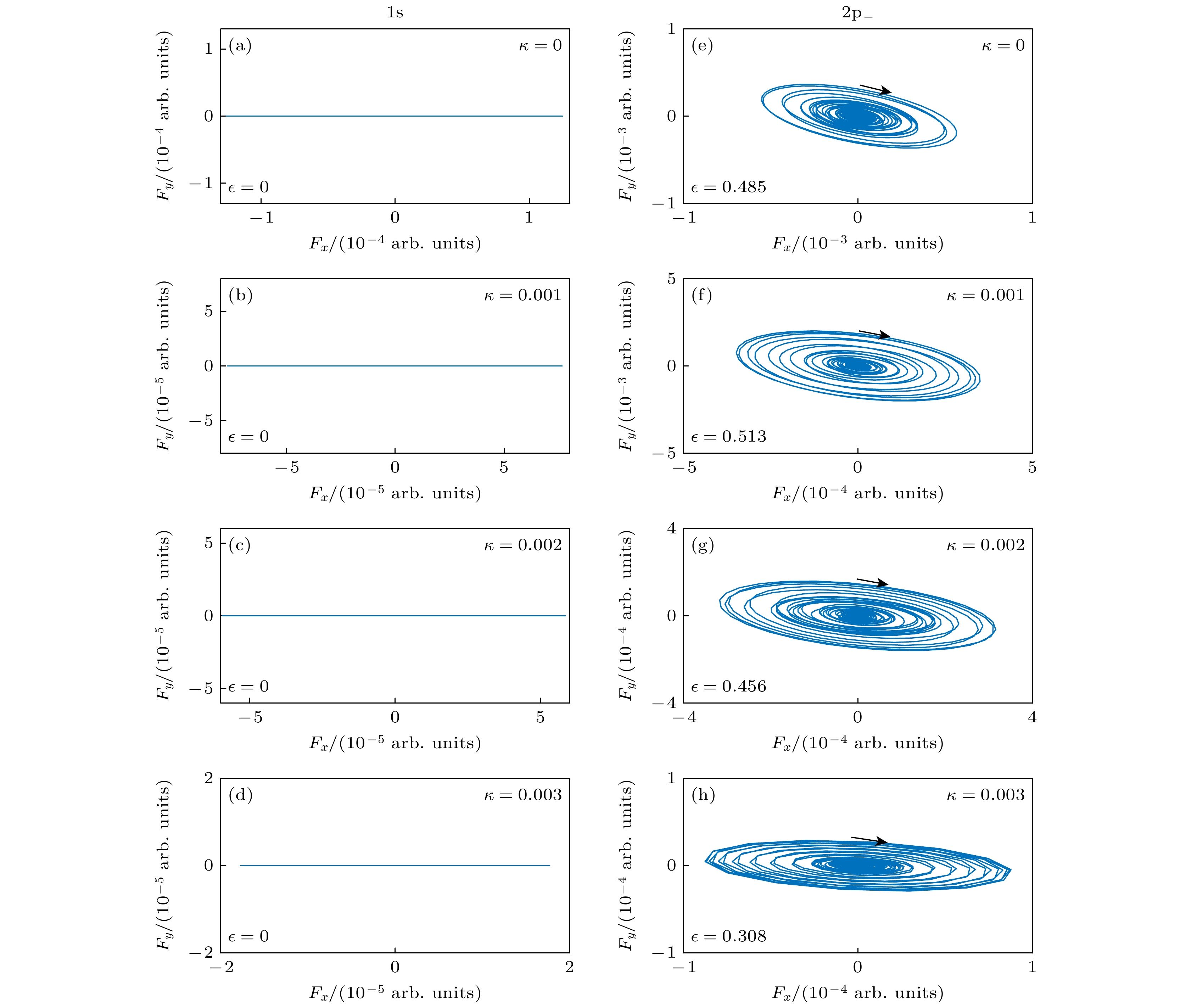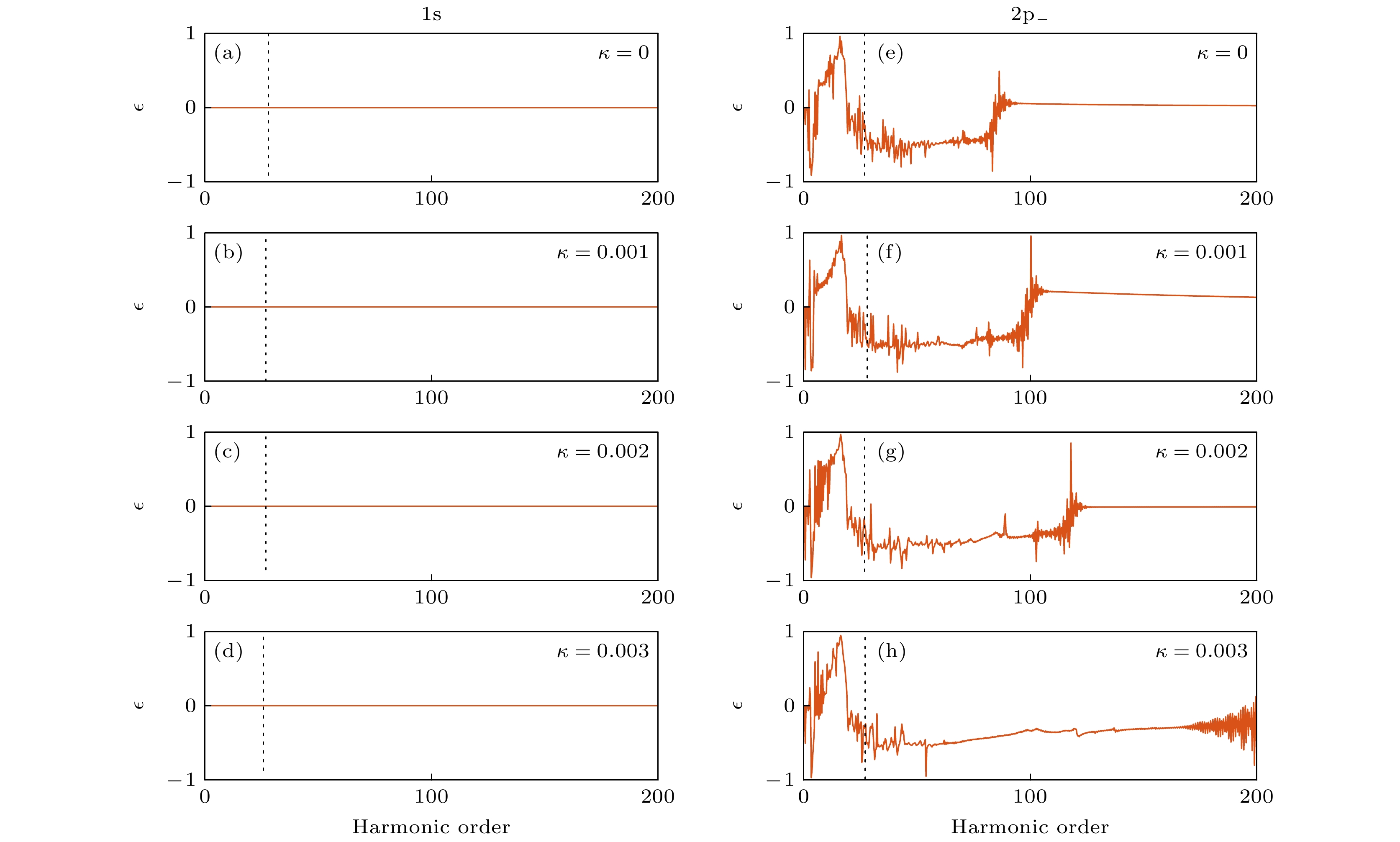 图 4 高次谐波椭偏率 (a) $ \kappa $ = 0, 1s轨道; (b) $ \kappa $ = 0.001, 1s轨道; (c) $ \kappa $ = 0.002, 1s轨道; (d) $ \kappa $ = 0.003, 1s轨道; (e) $ \kappa $ = 0, 2p-轨道; (f) $ \kappa $ = 0.001, 2p-轨道; (g) $ \kappa $ = 0.002, 2p-轨道; (h) $ \kappa $ = 0.003, 2p-轨道