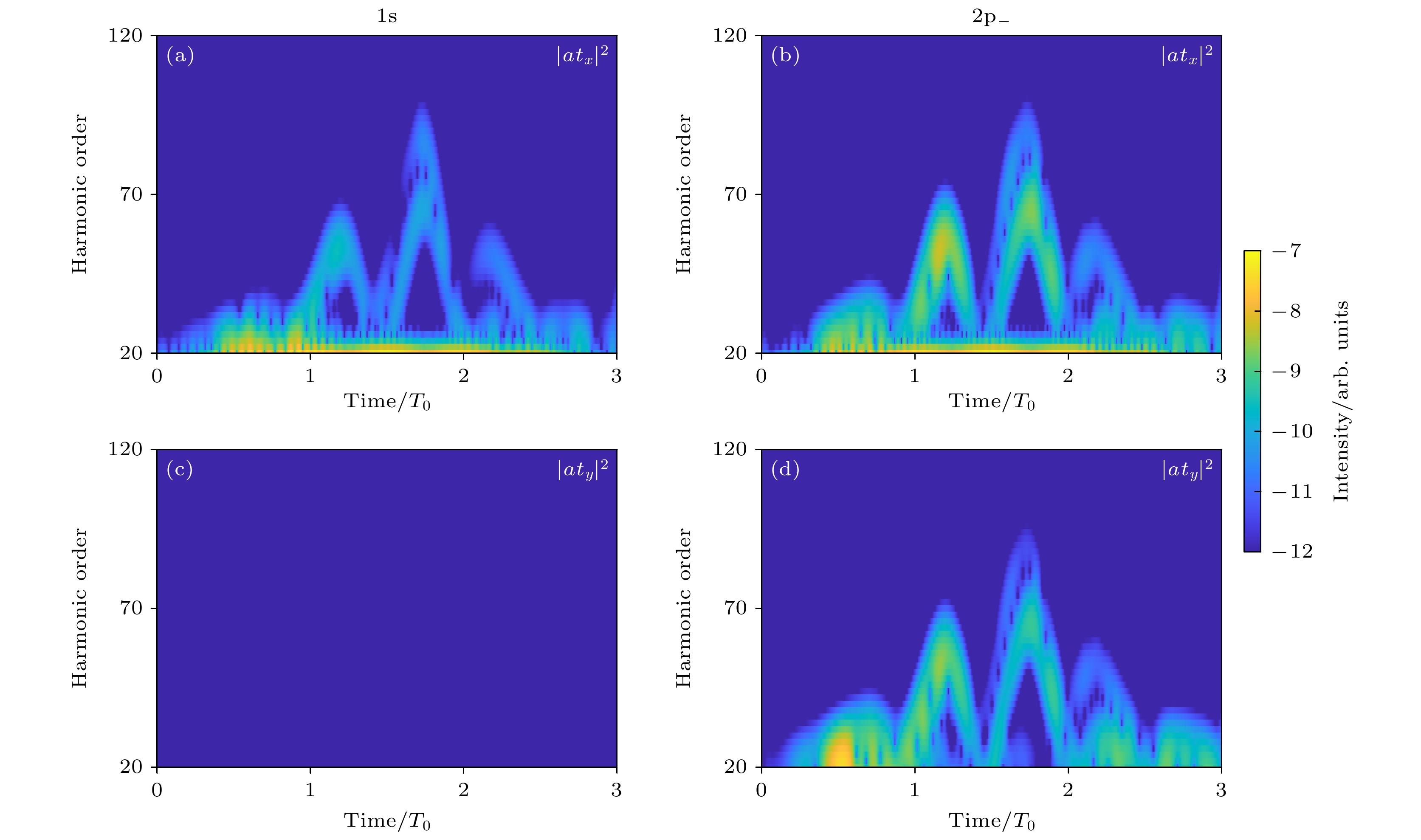 图 5 高次谐波的时频分析图 (a) $ \kappa $ = 0.001, 1s轨道x分量; (b) $ \kappa $ = 0.001, 2p-轨道x分量; (c) $ \kappa $ = 0.001, 1s轨道y分量; (d) $ \kappa $ = 0.001, 2p-轨道y分量