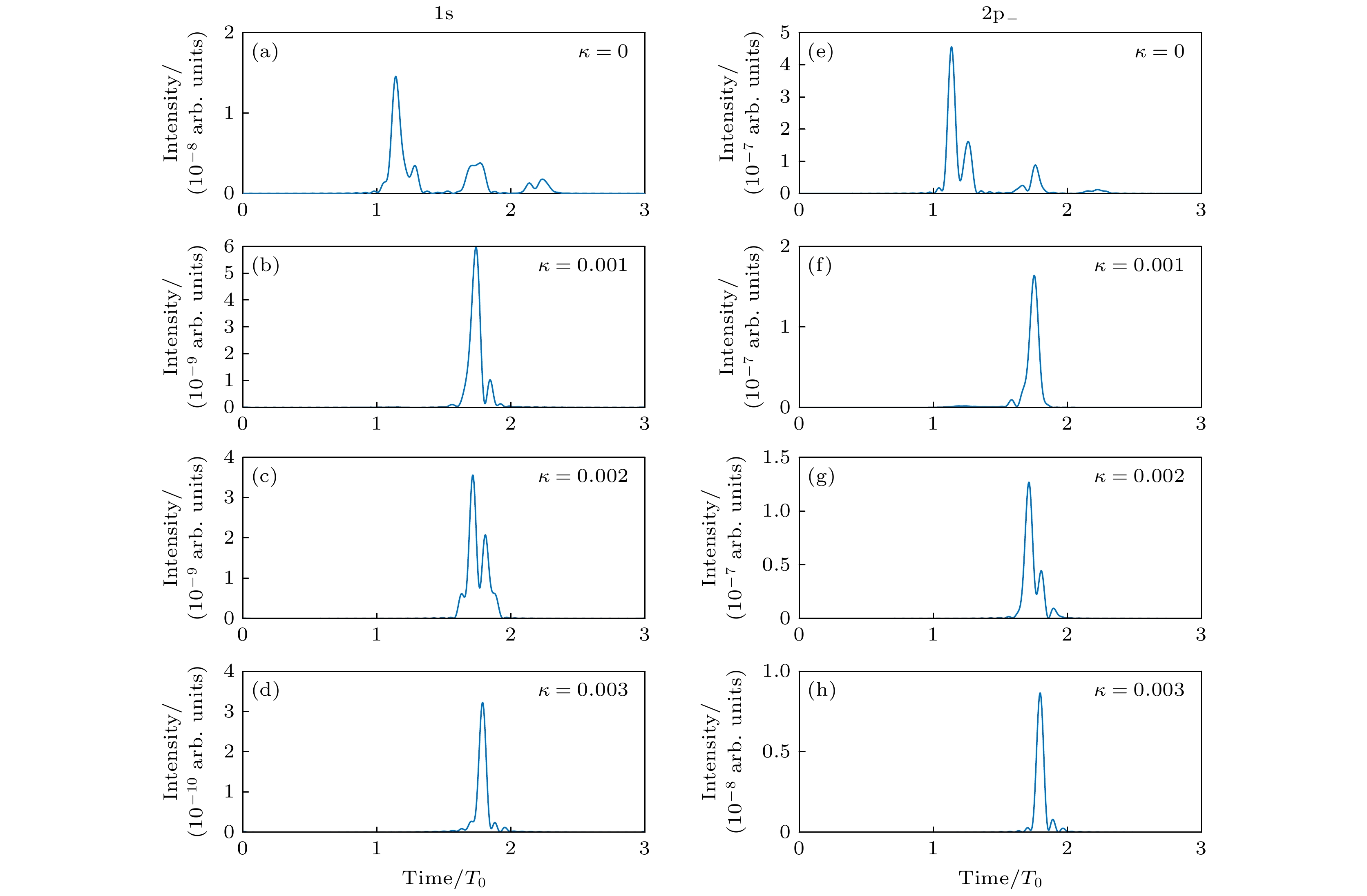图 6 阿秒脉冲时域包络 (a) $ \kappa $ = 0, 1s轨道; (b) $ \kappa $ = 0.001, 1s轨道; (c) $ \kappa $ = 0.002, 1s轨道; (d) $ \kappa $ = 0.003, 1s轨道; (e) $ \kappa $ = 0, 2p-轨道; (f) $ \kappa $ = 0.001, 2p-轨道; (g) $ \kappa $ = 0.002, 2p-轨道; (h) $ \kappa $ = 0.003, 2p-轨道