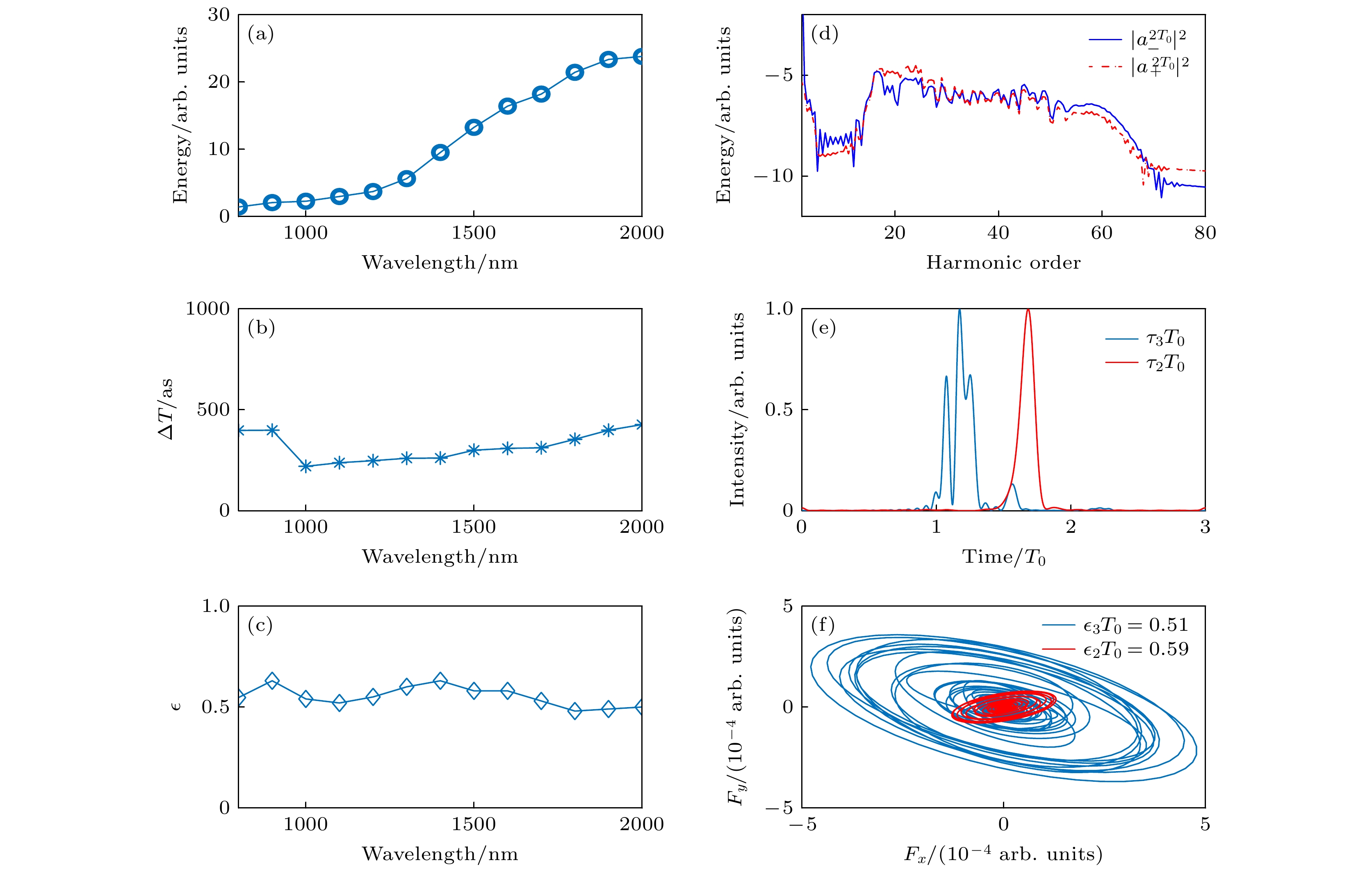 Fig. 8. (a)–(c) Cut-off energy of high harmonic spectra of the 2p- orbital, pulse duration and ellipticity versus the wavelength; (d)–(f) the high harmonic spectra, attosecond pulses and time-domain electric field for the driving field with $ {2 T}_{0} $ (The red solid lines represent the results for the driving field with $ {3 T}_{0} $). The attosecond pulses synthesized by the harmonics of 35th–40th. Other parameters are the same as those in Fig. 2(h).