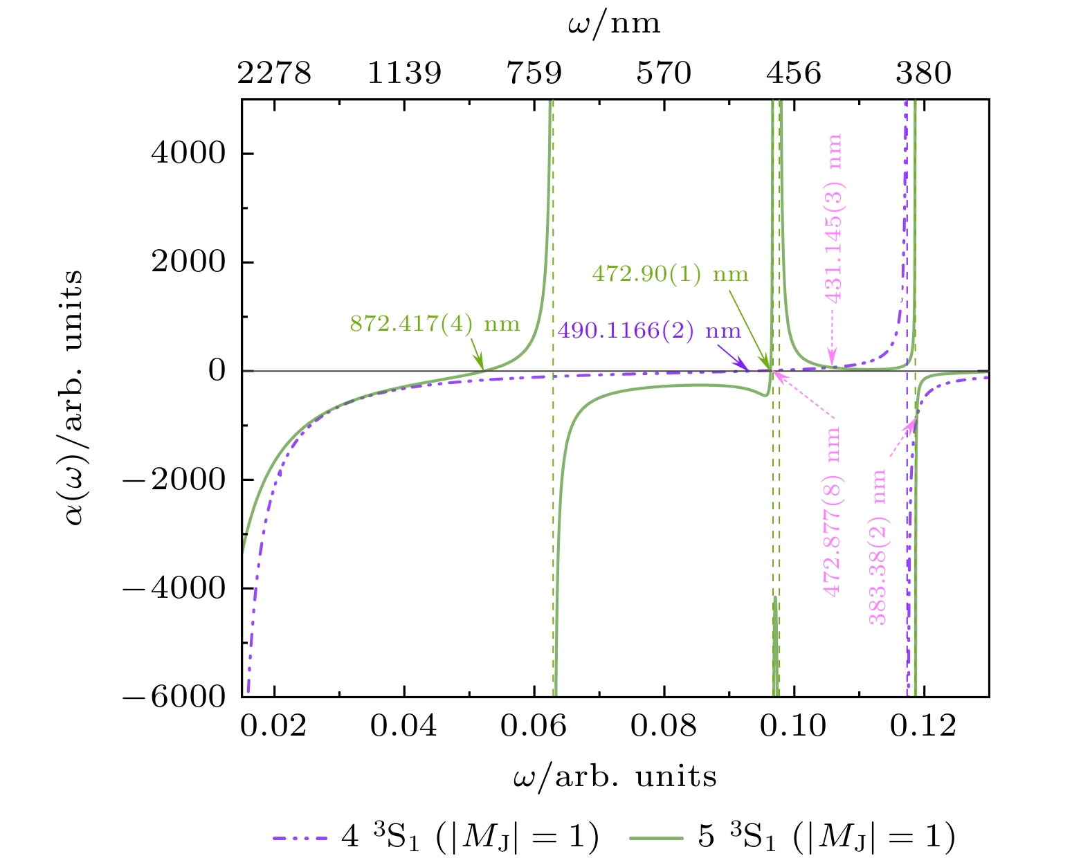 图 2 11Be2+离子$4^3 S_1$和$5^3 S_1$态$|M_J|=1$磁子能级的动力学电偶极极化率, 垂直虚线表示共振位置. 紫色和绿色数字分别表示$4^3 S_1(|M_J|=1)$和$5^3 S_1(|M_J|=1)$态的幻零波长, 玫红色数字表示使$4^3 S_1(|M_J|=1)$和$5^3 S_1(|M_J|= $$ 1)$态极化率相等的魔幻波长.