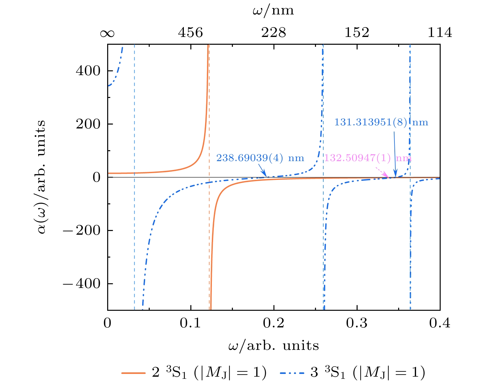 图 1 11Be2+离子$2^3 S_1$和$3^3 S_1$态$|M_J|=1$磁子能级的动力学电偶极极化率, 垂直虚线表示共振位置. 橘黄色和蓝色数字分别表示$2^3 S_1(|M_J|=1)$和$3^3 S_1(|M_J|=1)$态的幻零波长, 玫红色数字表示使$2^3 S_1(|M_J|=1)$和$3^3 S_1 $$ (|M_J|=1)$态极化率相等的魔幻波长.