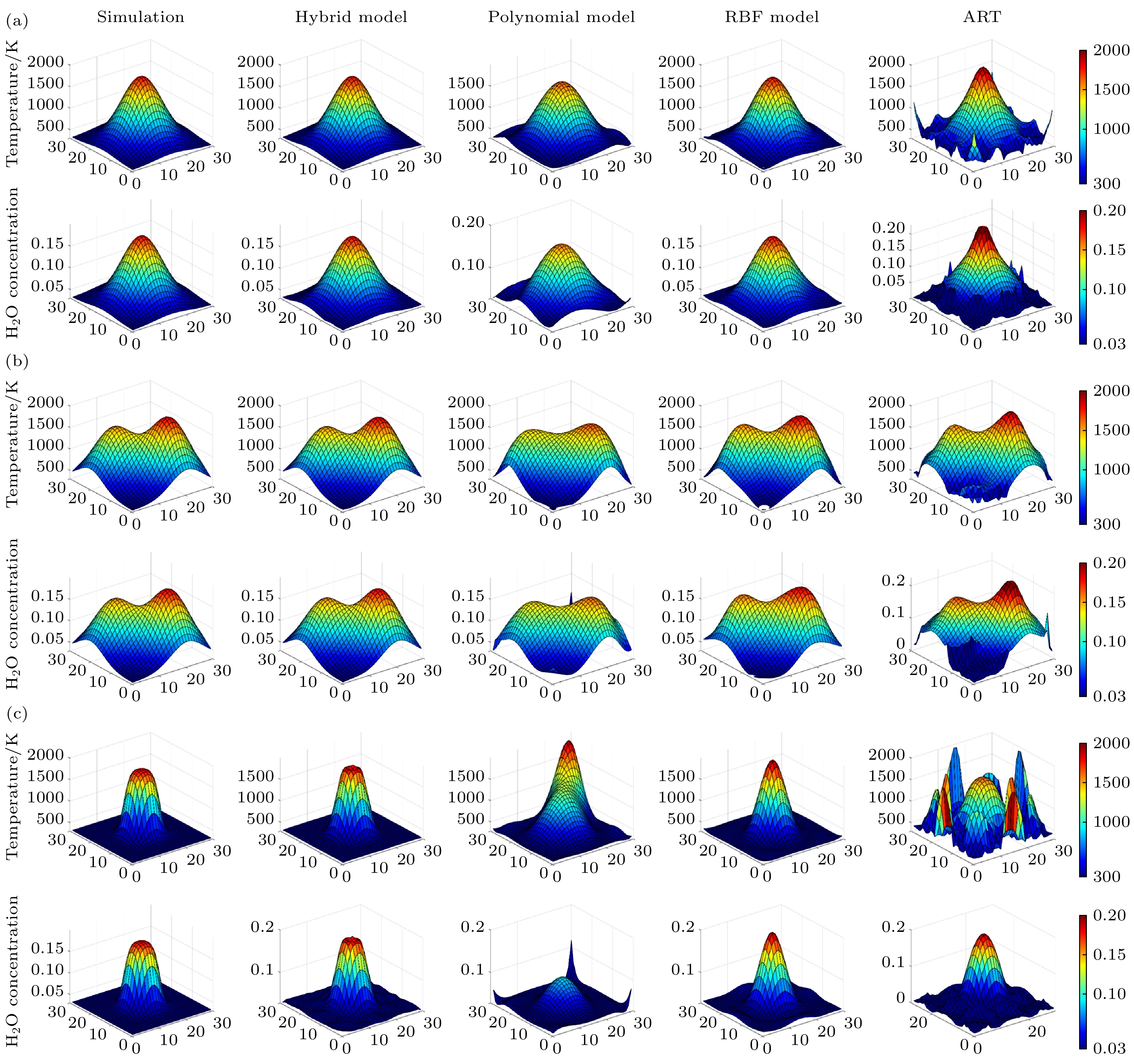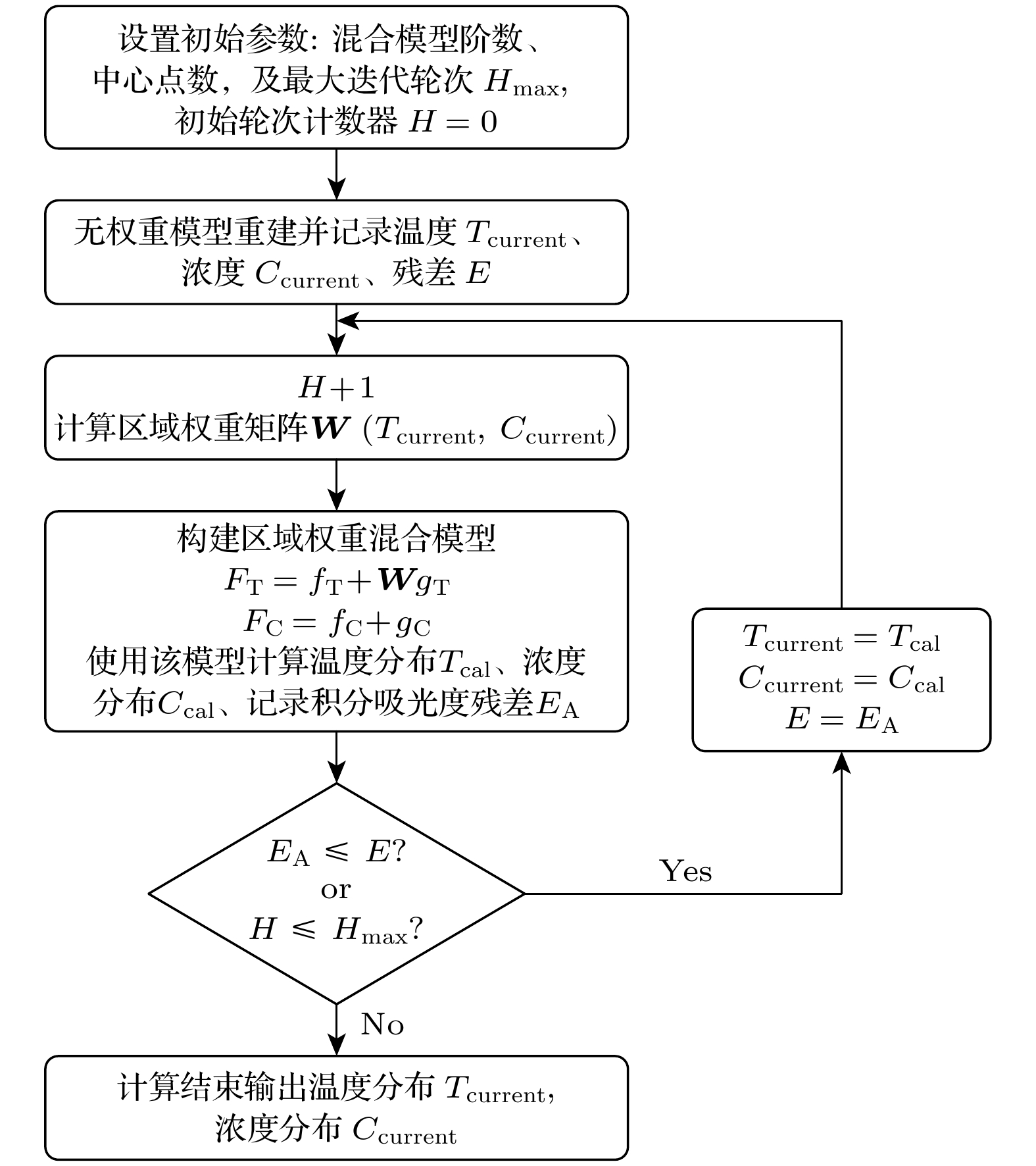 燃烧场温度与气体组分浓度的二维分布对发动机燃烧效率以及性能评估具有重要意义. 本文提出一种基于自适应区域权重混合模型的燃烧场温度和气体组分浓度二维重建方法, 提高复杂突变燃烧场重建精度. 通过区域权重机制将多项式模型与高斯径向基函数模型结合为混合模型, 并自适应迭代计算区域权重矩阵. 一方面通过区域权重矩阵保证了混合模型在兼顾全局特征的同时, 提高混合模型细节特征的描述能力; 另一方面, 在残差函数中加入区域权重正则化方法, 提升算法的精度. 数值模拟了三种燃烧场分布, 通过对比验证了混合模型的表征能力和重建精度, 结果表明, 混合模型算法重建误差低于单一模型及传统ART算法, 其温度、浓度分布重建最大误差分别为3.31%和7.13%. 并在标准McKenna燃烧器上搭建了扫描式TDLAS测量平台及热电偶测量平台对该方法进行实验验证, 重建结果与实际分布一致性较好, 1800 K下中心温度与热电偶测量结果偏差为10 K, 验证了该方法的有效性, 可为发动机燃烧场测量分析提供有效的参考.