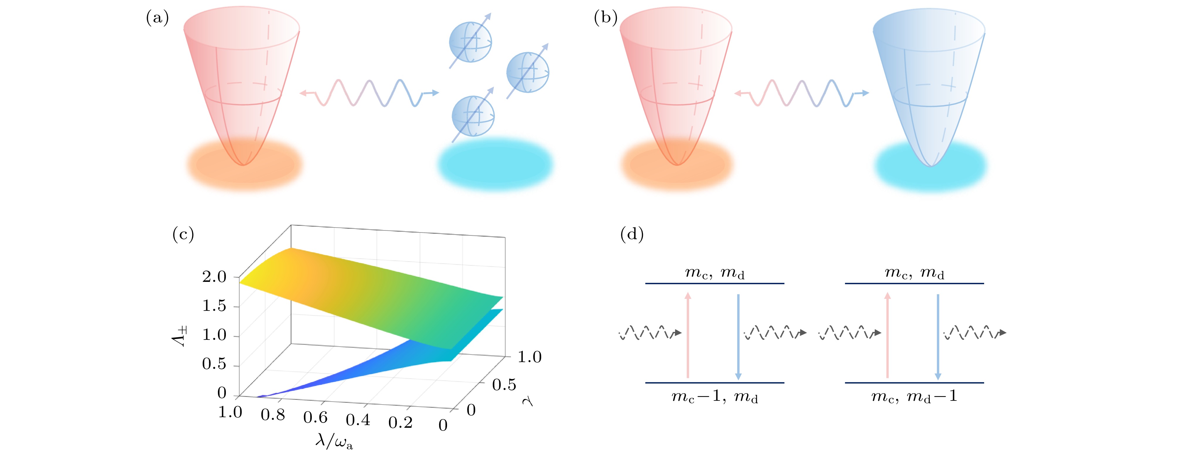 图 1 (a), (b)各向异性Dicke模型和耦合谐振子模型的示意图, 其中光子和量子比特分别与各自热库相互作用; (c)方程(3)处的耦合振子哈密顿量在参数$ \omega_{\mathrm{a}}=1 $, $ \varepsilon=0.8\omega_{\mathrm{a}} $下的两个本征模; (d)在本征基矢下耦合振子系统与热库之间的非相干能量交换过程