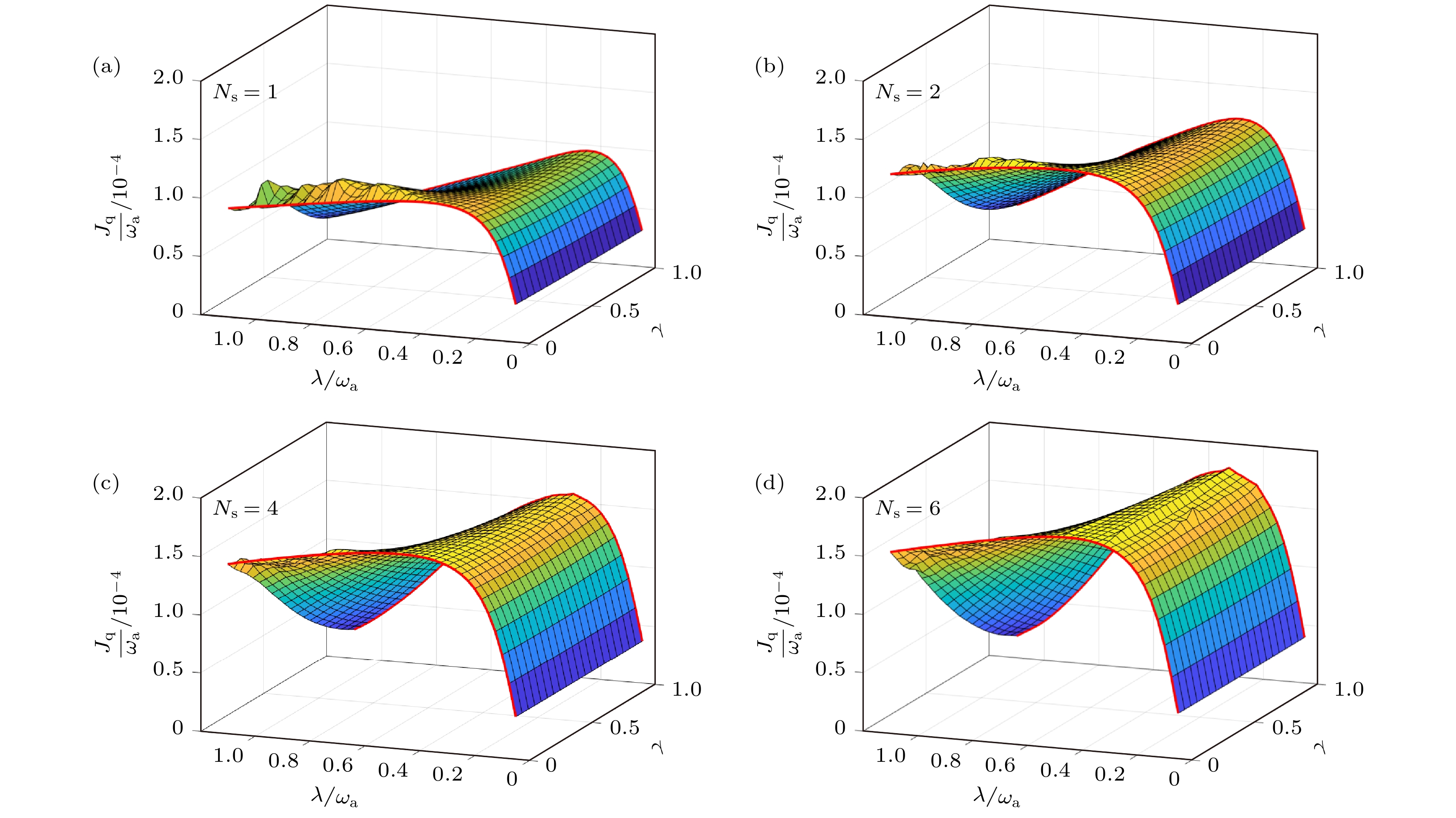 Fig. 2. Influences of qubit-photon coupling strength λ and anisotropic factor γ on steady state heat flow $ J_{\mathrm{q}} $ in (a) $ N_{\mathrm{s}}=1 $, and finite numbers of qubits (b) $ N_{\mathrm{s}}=2 $, (c) $ N_{\mathrm{s}}=4 $, and (d) $ N_{\mathrm{s}}=6 $. The redlines denote heat flows at $ \gamma=0 $ and $ \gamma=1 $ limiting cases. System parameters are given by $ \omega_{\mathrm{a}}=1 $, $ \varepsilon=0.8\omega_{\mathrm{a}} $, $ \omega_{\mathrm{c}}=20\omega_{\mathrm{a}} $, $ \alpha_{\mathrm{r}}=\alpha_{\mathrm{q}}=0.001\omega_{\mathrm{a }}$, $ T_{\mathrm{r}}=1.2\omega_{\mathrm{a}} $, and $ T_{\mathrm{q}}=0.6\omega_{\mathrm{a}} $.