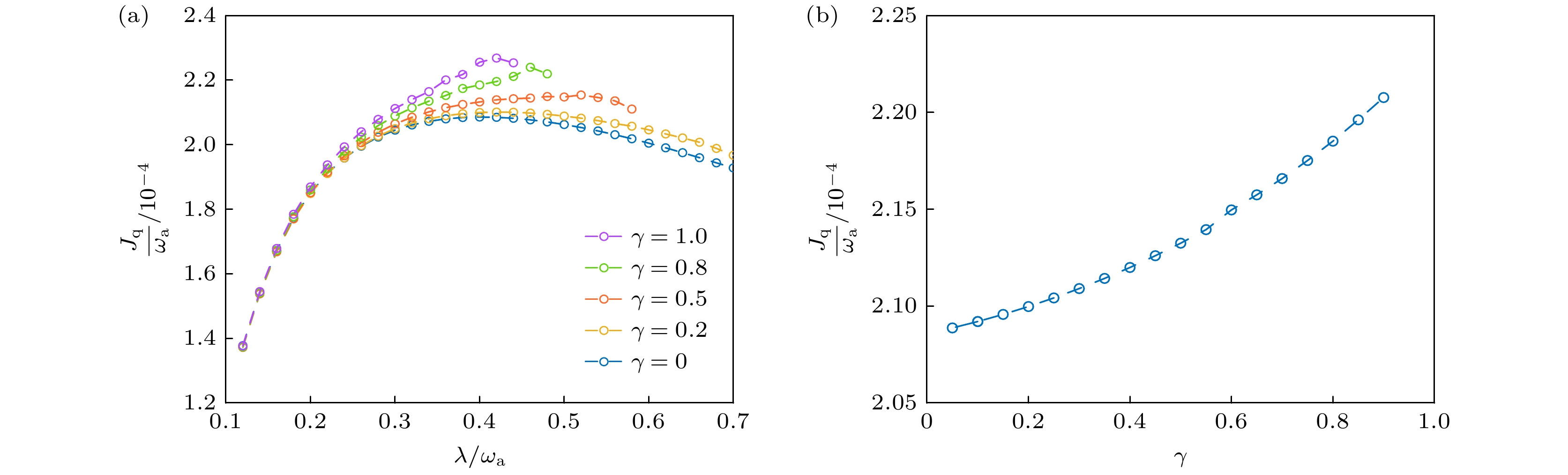 Fig. 3. (a) Steady-state heat flow of the nonequilibrium two-coupled-oscillator model by tuning the qubit-photon interaction strength with various anisotropic factors; (b) the influence of anisotropic factor on the heat flow at $ \lambda/\omega_{\rm a}=0.4 $. Other system parameters are given by $ \omega_{\mathrm{a}}=1 $, $ \varepsilon=0.8\omega_{\mathrm{a}} $, $ \omega_{\mathrm{c}}=20\omega_{\mathrm{a }}$, $ \alpha_{\mathrm{r}}=\alpha_{\mathrm{q}}=0.001\omega_{\mathrm{a}} $, $ T_{\mathrm{r}}=1.2\omega_{\mathrm{a}} $, and $ T_{\mathrm{q}}=0.6\omega_{\mathrm{a }}$.