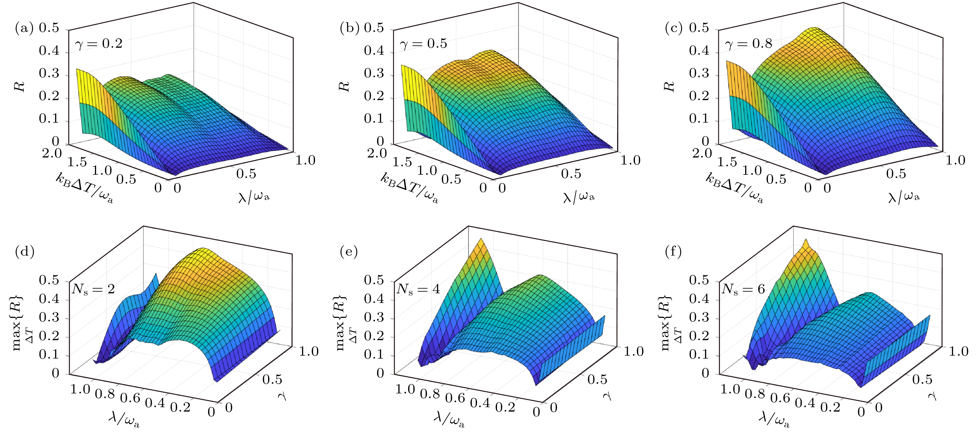 Fig. 4. Thermal rectification factor $ {\cal{R}} $ by tuning qubit-photon coupling strength λ and temperature bias $ \varDelta{T} $ ($ T_{\mathrm{r}}=T_0+{\varDelta}T/2 $, $ T_{\mathrm{q}}=T_0-{\varDelta}T/2 $, and $ T_0=\omega_{\mathrm{a}} $) with $ N_{\mathrm{s}}=2 $ at (a) $ \gamma=0.2 $, (b) $ \gamma=0.5 $, and (c) $ \gamma=0.8 $. Maximal value of $ {\cal{R}} $ by searching over the temperature bias as a function of λ and γ with (d) $ N_{\mathrm{s}}=2 $, (e) $ N_{\mathrm{s}}=4 $, and (f) $ N_{\mathrm{s}}=6 $. Other system parameters are given by $ \omega_{\mathrm{a}}=1 $, $ \varepsilon=0.8\omega_{\mathrm{a}} $, $ \omega_{\mathrm{c}}=20\omega_{\mathrm{a}} $, and $ \alpha_{\mathrm{r}}=\alpha_{\mathrm{q}}=0.001\omega_{\mathrm a} $.