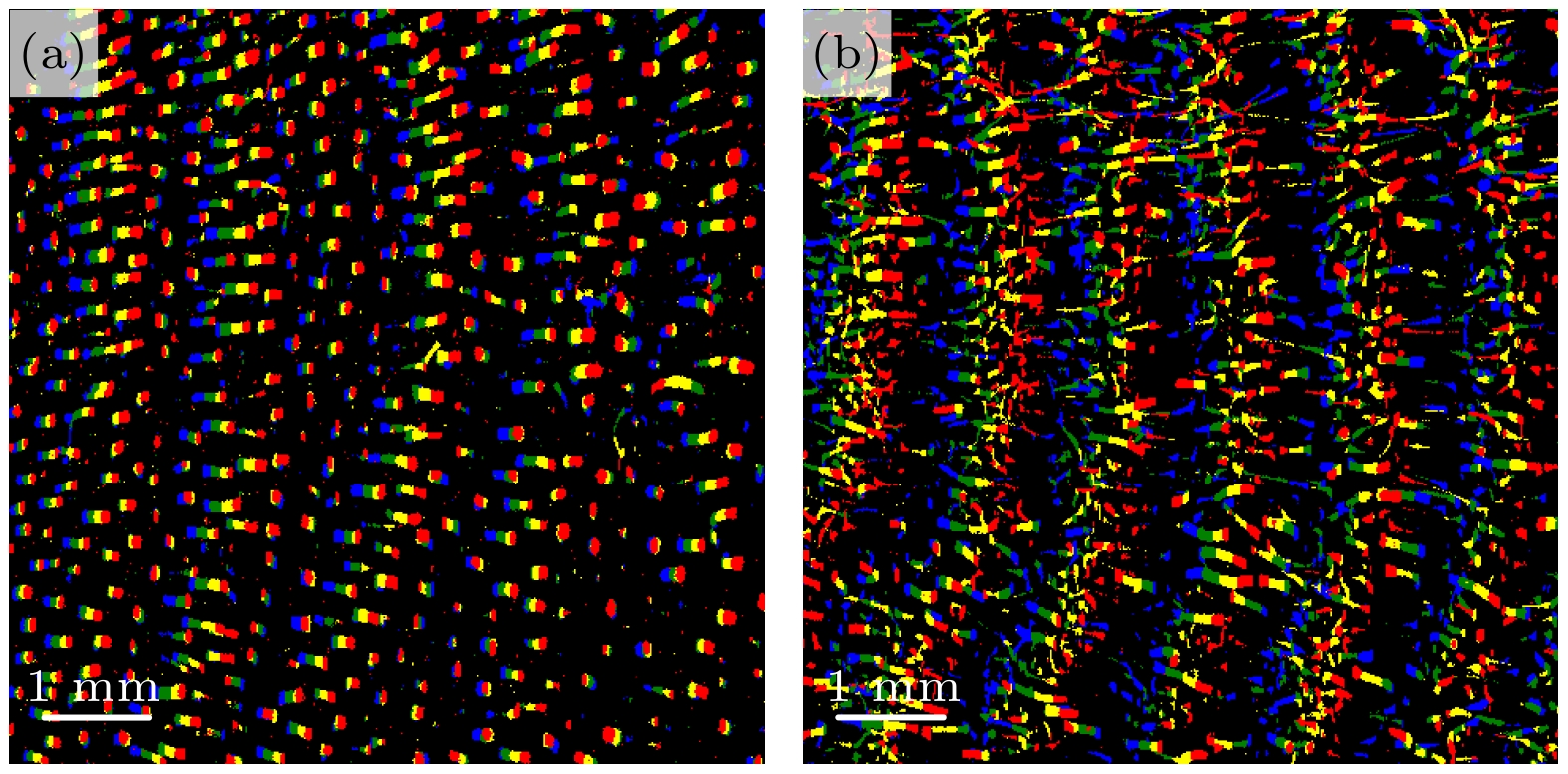 复杂等离子体是由电离气体与介观颗粒组成的非平衡复杂系统. 在微重力条件下, 颗粒克服重力沉降作用, 在放电空间形成三维复杂等离子体. 在国际空间站微重力实验载荷PK-4直流放电中, 先后注入两种直径分别为6.8 μm与3.4 μm的球形树脂颗粒, 在电场力、离子拖拽力的作用下, 大小颗粒通常无法在同一区域混合共存, 发生相分离. 在颗粒注入过程中, 小颗粒从大颗粒云中通过, 在不同条件下产生不同的非平衡自组织结构. 当大颗粒云密度较低时, 小颗粒在汤川排斥作用下, 在放电管中心形成穿越通道; 当大颗粒云密度中等时, 大小颗粒在穿越过程中各自形成行结构; 当大颗粒云密度较大时, 由双流不稳定性产生自激发尘埃声波, 此时, 小颗粒在穿越过程中与大颗粒相互作用, 与小颗粒进入前的尘埃声波参数相比, 波峰的颗粒密度显著上升, 然而波长与频率等宏观物理参数并没有发生明显的变化. 本研究系统总结了微重力条件下双分散复杂等离子体颗粒注入中的多种自组织过程与机理.Complex plasmas are composed of ionized gases and mesoscopic particles, representing a typical non-equilibrium complex system. The particles are negatively charged due to the higher thermal velocity of the electrons and interact with each other via Yukawa interactions. Due to the easy recording of the motion of individual particles through video microscopy, the generic processes in liquids and solids in complex plasma can be studied at a kinetic level. Under microgravity conditions, the particles are confined in the bulk plasma and form a three-dimensional cloud. In the PK-4 Laboratory on the International Space Station, melamine formaldehyde particles with diameters of 6.8 μm and 3.4 μm are continuously injected into the plasma discharge. Due to the electrostatic force and ion drag force, usually, the particles cannot be mixed in the same region, thereby leading to a phase separation. During the particle injection, small particles penetrate into the big particle clouds and selforganize in different way under different conditions. When the number density of the big particles is low, small particles form a channel in the center of the discharge tube due to the Yukawa repulsion, where the big particle cloud is weakly confined. When the number density of the big particles is moderate, small particles will form channels during the penetration, representing a typical nonequilibrium self-organization. When the number density of the big particles is high, dust acoustic waves are self-excited due to the two-stream instability. As the small and big particles interact with each other, the number density of particles in the wave crests sharply increases. However, the wave numbers and frequencies remain unchanged. This investigation offers insights into the different self-organizations during the particle injections into three-dimensional binary complex plasmas under microgravity conditions.