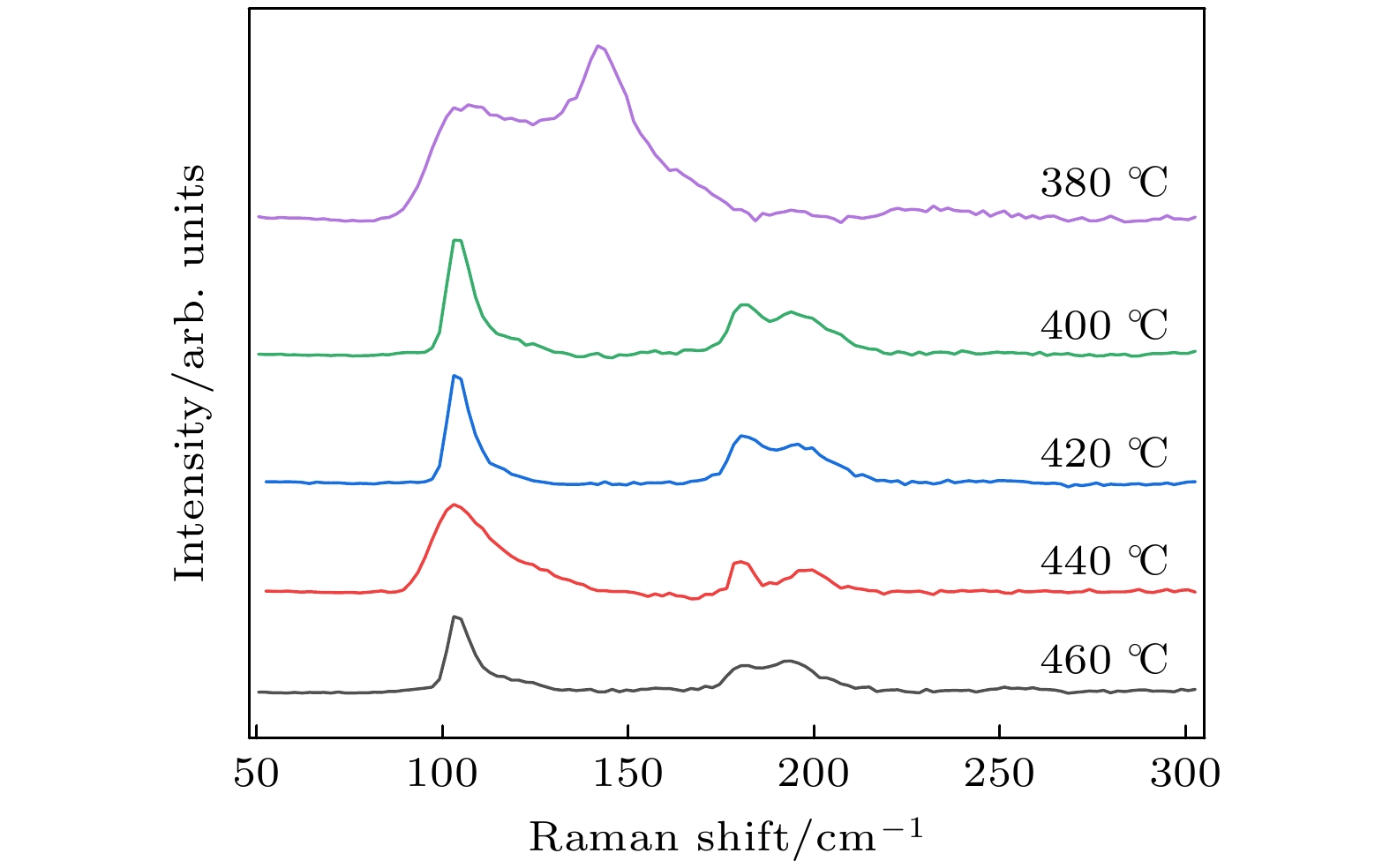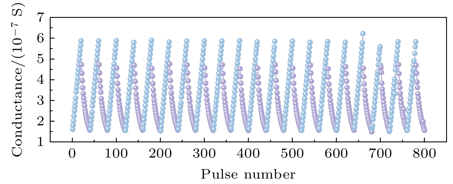 二维铁电半导体α-In2Se3在新型电子器件中具有重要应用前景. 然而采用化学气相沉积法(CVD), 该材料通常需要高于650 ℃的高温. 本研究提出一种低温合成策略, 通过引入KCl/LiCl/NH4Cl三元催化剂体系, 在400—460 ℃(优化条件440 ℃)制备α-In2Se3薄膜, 该工艺较传统方法降低温度200 ℃以上. 扫描电子显微镜(SEM)表征显示材料形貌可通过温度与气体流速协同调控, 从六边形薄片转变为连续均匀薄膜; 能量色散谱仪(EDS)分析表明元素比例接近理想化学计量比(In∶Se = 36.38∶63.62); 拉曼光谱(特征峰103/180/195 cm–1) 与X射线光电子能谱(XPS) (In∶Se = 1.92∶3.00) 共同证实材料为纯α相、化学计量比接近理想值. 基于此材料构建的阻变器件表现出模拟阻变的特性, 模拟了生物突触的长时程增强/抑制行为. 在人工神经网络仿真中, 对MNIST数据集的图像识别准确率均在90%以上. 该低温合成工艺突破高温限制, 为α-In2Se3在硅基神经形态计算芯片中的规模化集成提供可行路径.Two-dimensional ferroelectric α-In2Se3 possesses many fascinating physical properties. However, chemical-vapor-deposited ferroelectric α-In2Se3 typically requires high temperatures (>650 ℃). In this work, α-In2Se3 is synthesized at 400 to 460 ℃ by introducing a KCl/LiCl/NH4Cl ternary catalyst, resulting in a 200 ℃ reduction in growth temperature compared with ferroelectric α-In2Se3 synthesized by the traditional chemical vapor deposition (CVD) method. The surface morphology of the as-prepared material is controlled by temperature and gas flow rate. As the growth temperature increases from 400 to 460 ℃, the synthesized α-In2Se3 is changed from discrete hexagonal flakes to a continuous and uniform thin film, which is confirmed by the scanning electron microscope. Raman spectroscopy shows that the characteristic peaks of In2Se3 are located at 103, 180, and 195 cm–1, respectively, indicating that the CVD-grown In2Se3 is α-phase. Furthermore, energy dispersive spectrometer and X-ray photoelectron spectroscopy indicate that the elemental composition is close to the ideal stoichiometric ratio, confirming the successful synthesis of the α-In2Se3. Then, the as-prepared α-In2Se3 is transferred onto Si/SiO2 substrate for device fabrication. Atomic force microscope indicates that the film is uniform, with an approximate thickness of 63 nm. The fabricated two-terminal memristors exhibit analogous resistive switching behaviors. And such memristors are used to achieve synaptic functions of long-term potentiation/long-term depression. For artificial neural network simulations based on the synaptic memristors, the recognition accuracy for hand-written digit image exceeds 90%. This work provides a practical method for growing two-dimensional ferroelectric α-In2Se3 at low temperatures for applications in synaptic devices and neuromorphic computing.