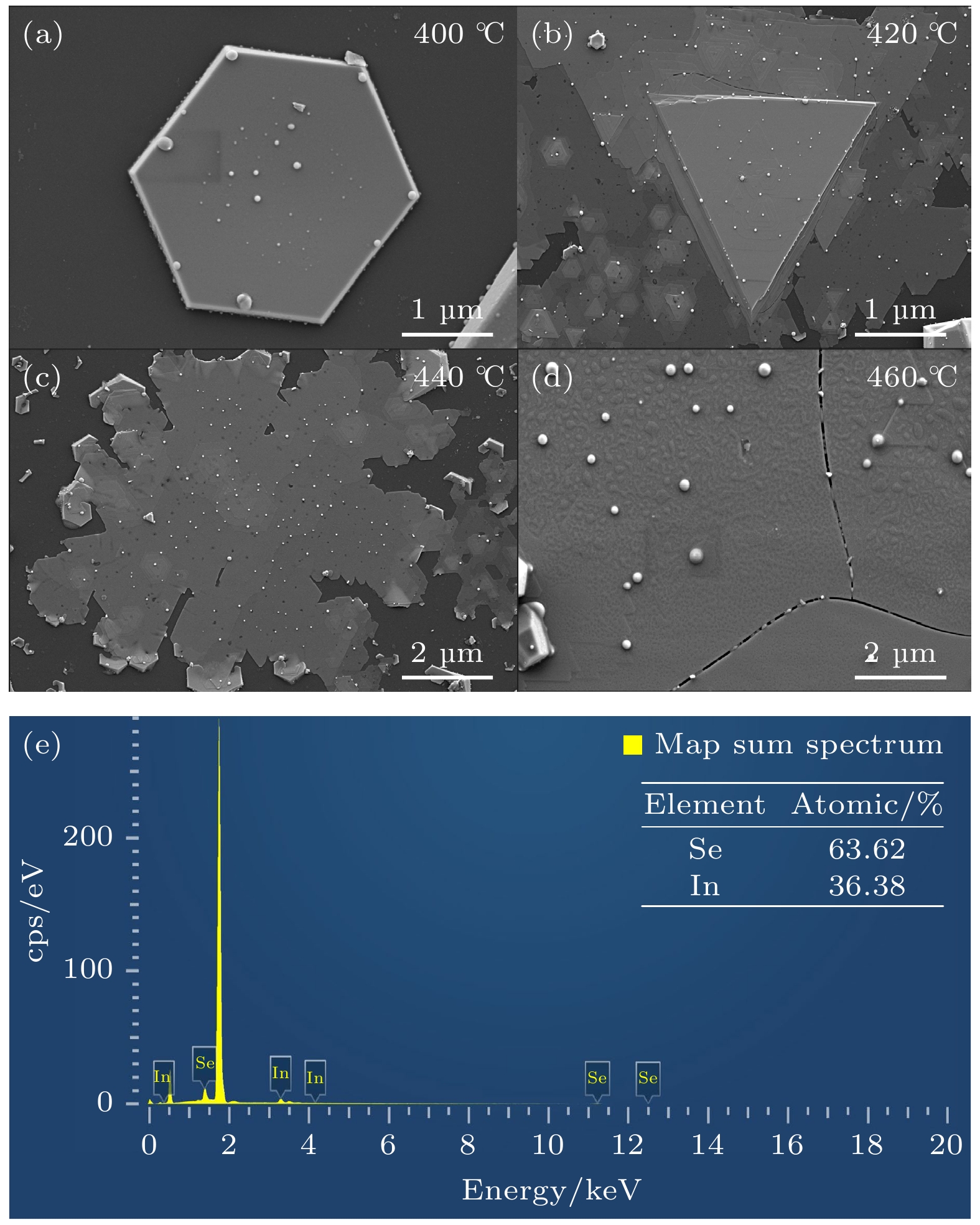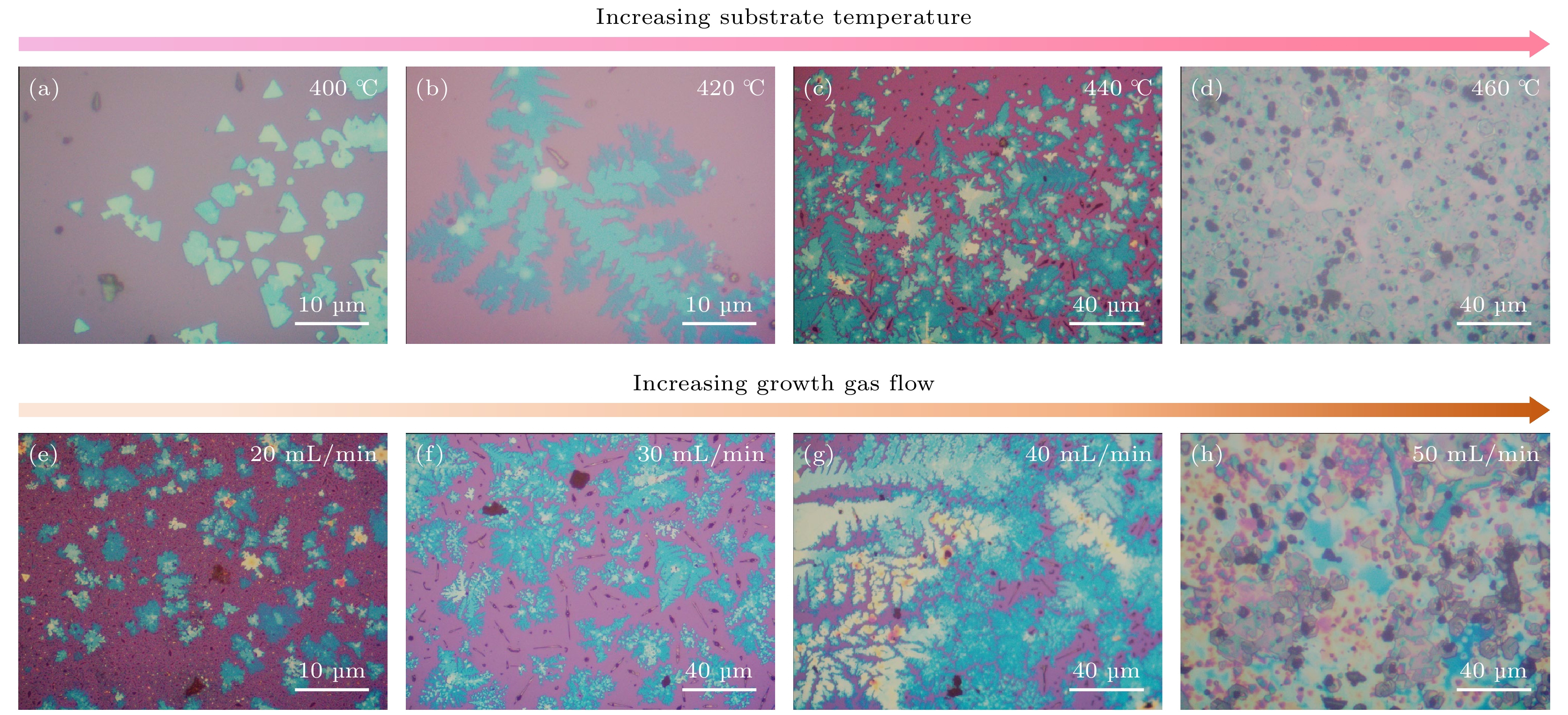 Fig. 3. (a)–(d) Optical images of In2Se3 flakes grown at gas flow rate of 20 sccm and different growth temperature; (e)–(h) optical images of In2Se3 flakes grown at 440 ℃ and different gas flow rate (standard condition).