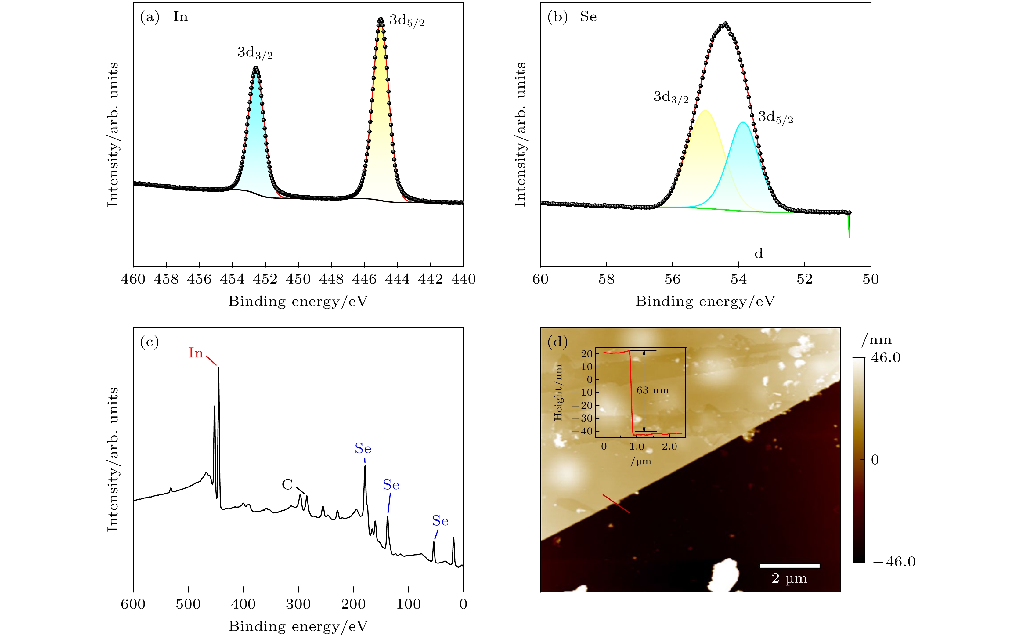 图 5 (a) In 3d3/2和In 3d5/2的XPS能谱; (b) Se 3d3/2和Se 3d5/2的XPS能谱; (c) 合成α-In2Se3的XPS能谱; (d) α-In2Se3 AFM图像及对应的高度剖面图