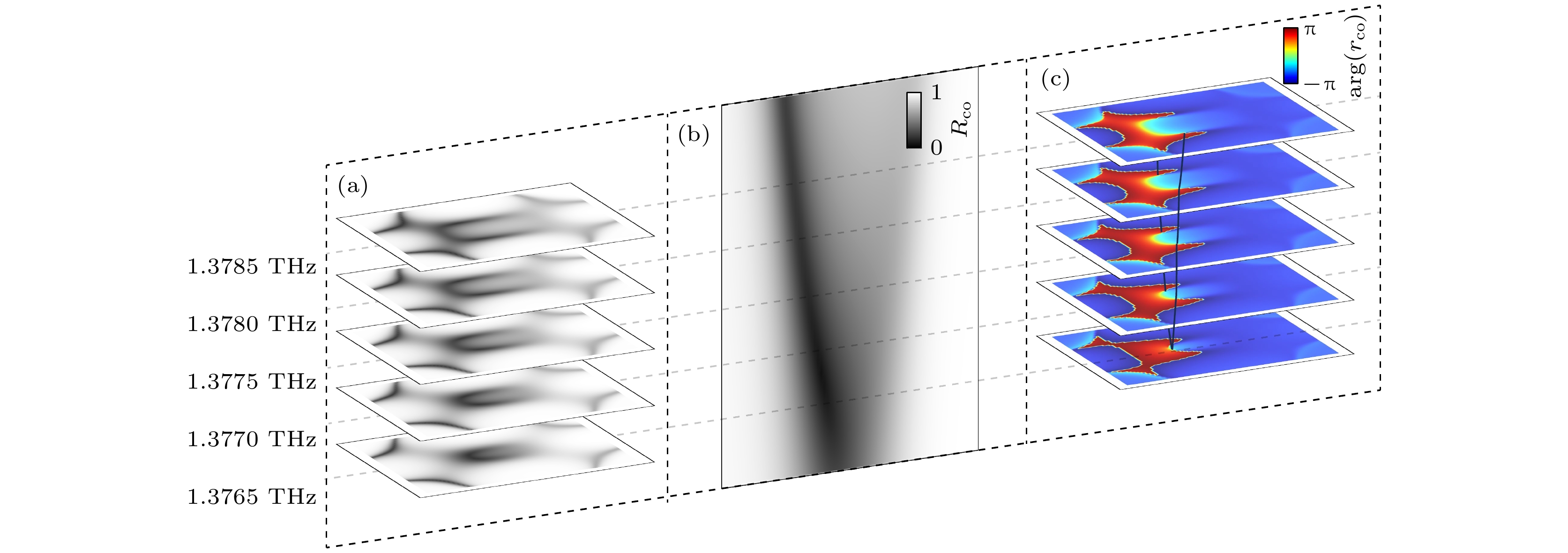 图 5 三维频率-波矢空间中拓扑暗线的仿真验证 (a), (c) 不同频率下波矢空间的反射率图和相位图, 其中拓扑暗线用黑色曲线表示; (b) ky = 0时, 传输散射方程在$\omega - {k_x}$域的同极化反射幅度图