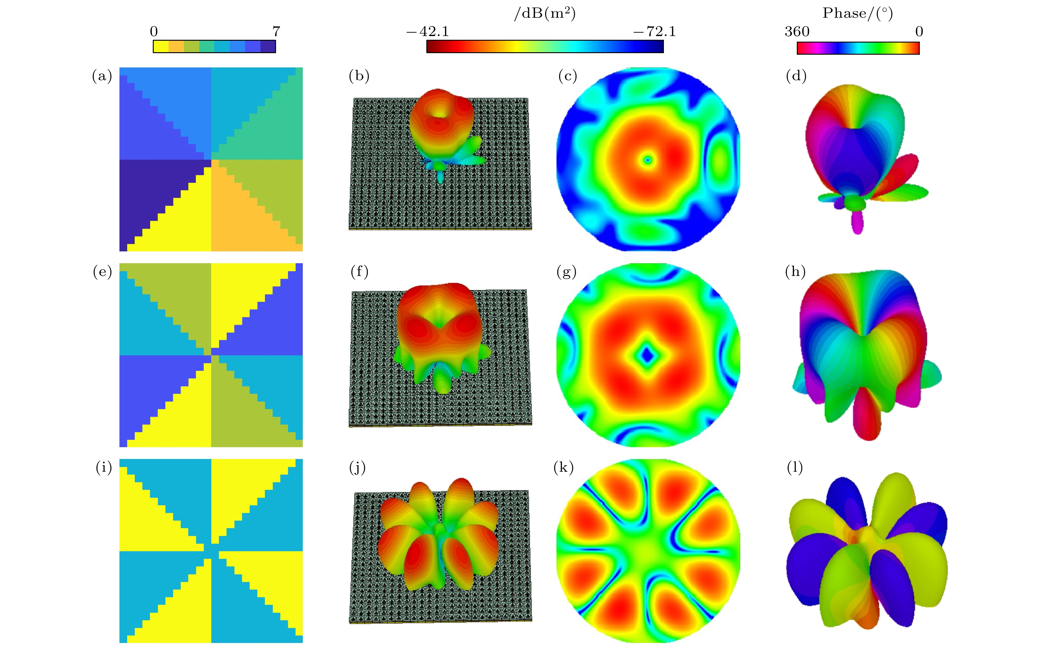 图 6 VO2为金属态时, 入射RCP光下生成拓扑荷数为1的OV对应的(a)涡旋编码布局图, (b) 3D远场幅度图, (c) 2D幅度图, (d) 3D远场相位图; 生成拓扑荷数为2的OV对应的(e)涡旋编码布局图, (f) 3D远场幅度图, (g) 2D幅度图, (h) 3D远场相位图; 生成拓扑荷数为4的OV对应的(i)涡旋编码布局图, (j) 3D远场幅度图, (k) 2D幅度图, (l) 3D远场相位图