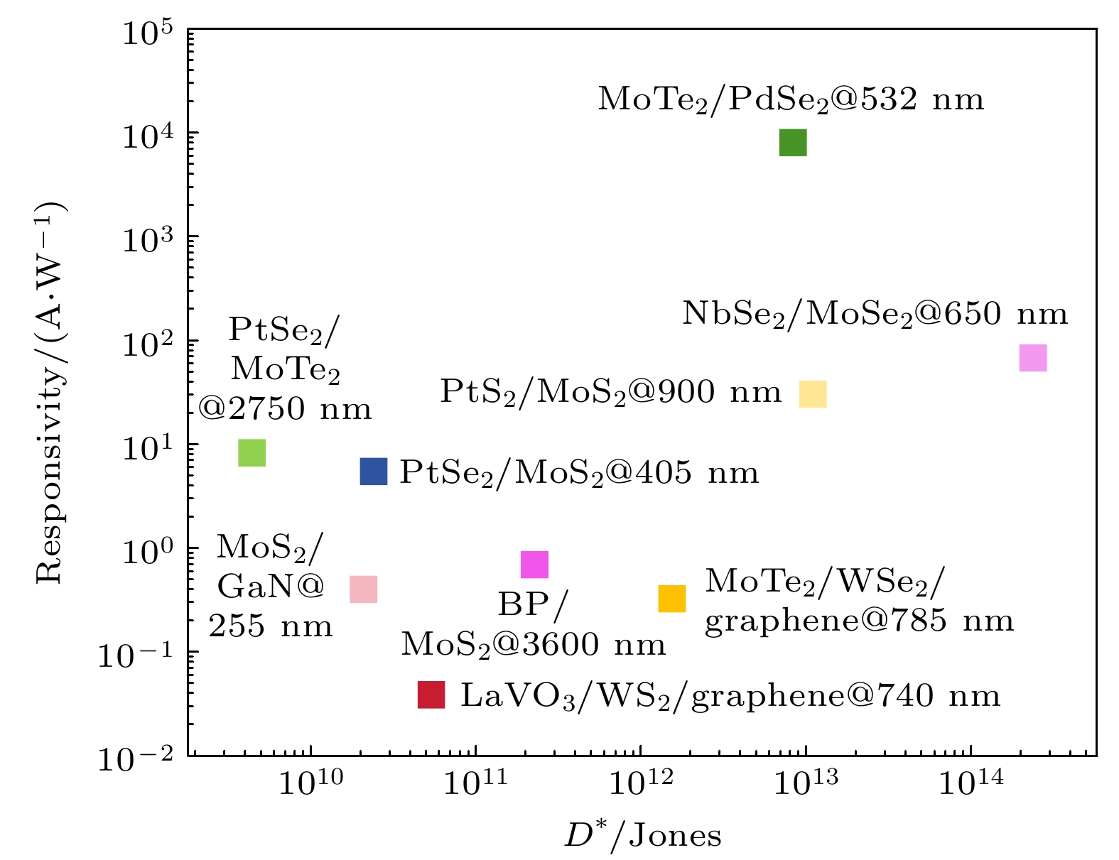 表 2 二维材料阵列可扩展性与均匀性(其中σ/μ表示标准差和均差的比值, 用于比较响应度是否均匀)