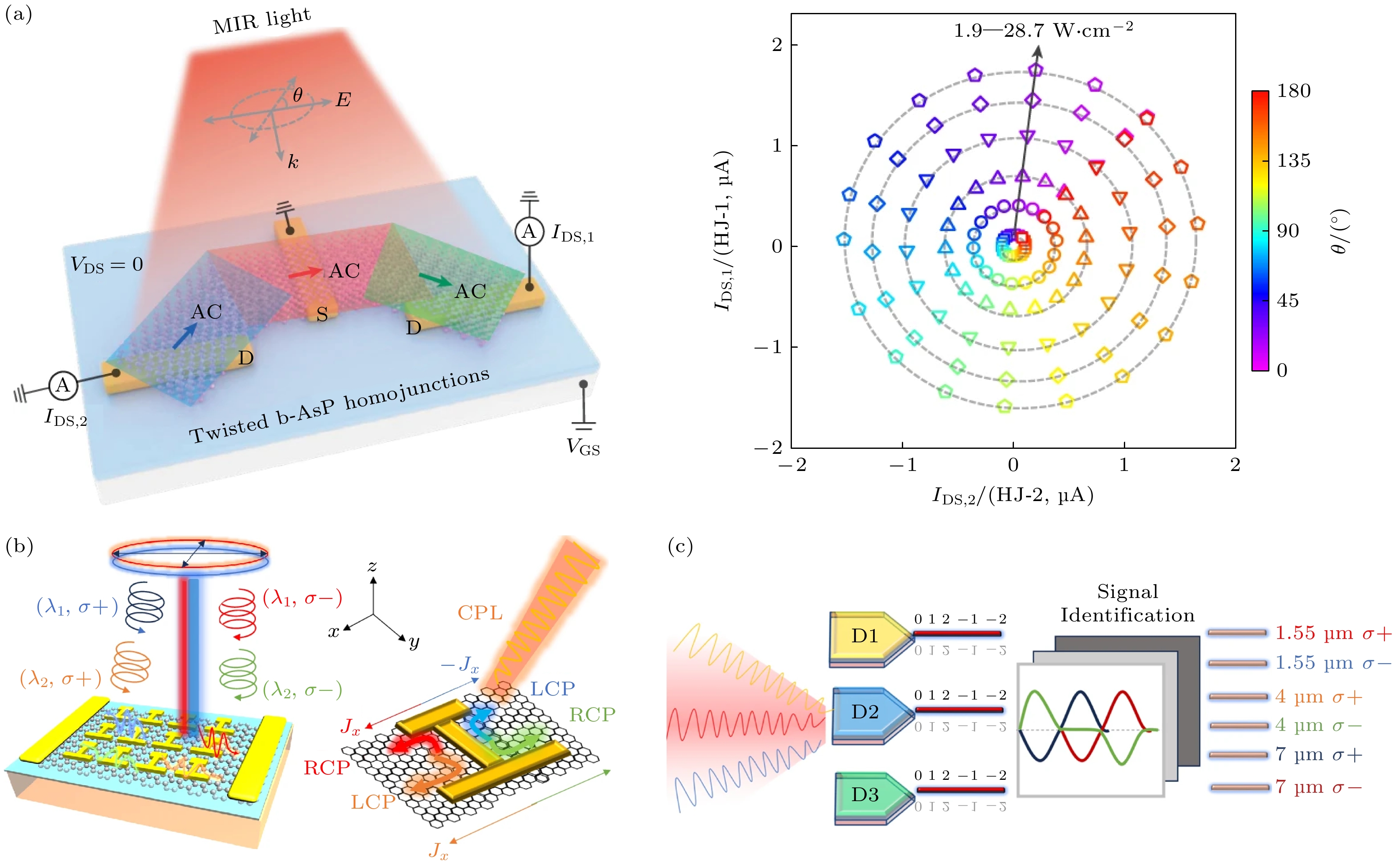 Fig. 4. (a) Twisted b-AsP homojunctions demonstrated simultaneous detection of full linear polarization states and intensity information. Reproduced with permission from Ref.[60]; (b) the dual-arm metasurface structure on graphene can localize light of different wavelengths and handedness on either side of the dual arms, generating vectorial photocurrents with varying magnitudes and directions. CPL, LCP, and RCP respectively represent circularly polarized light, left-handed circularly polarized light, and right-handed circularly polarized light[62]; (c) schematic representation of the extraction of three-wavelength circularly polarized signals. In the case of mixed light incidence, the processing of photovoltage signal encoding allows for the extraction of the wavelength and circular polarization information of the incident light. Reproduced with permission from Ref.[62].