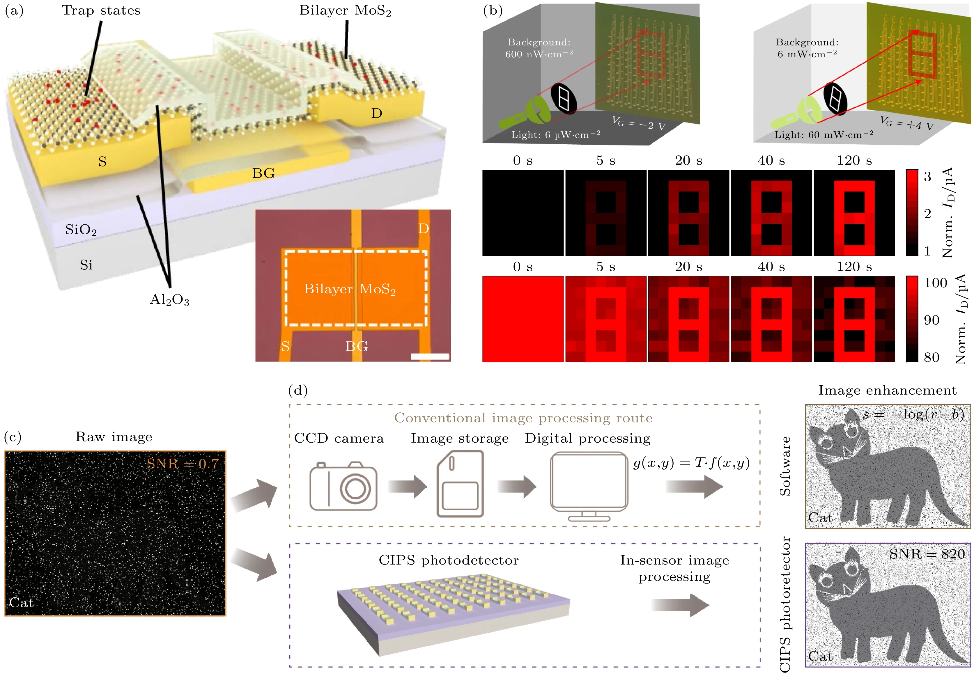 图 5 (a) MoS2光电晶体管原理图. 插图: 单个MoS2的光学显微镜图像光电晶体管[66]; (b) 明、暗背景下8 pixel×8 pixel阵列的示意图以及“8”随时间变化过程(出自文献[66], 已获得授权); (c) 高噪声图像示例, 其中信号目标被噪声完全掩盖, SNR约为0.7; (d) 传统CCD相机+存储+软件对数变换处理路线与CIPS阵列直接输出的结果(出自文献[67], 已获得授权)