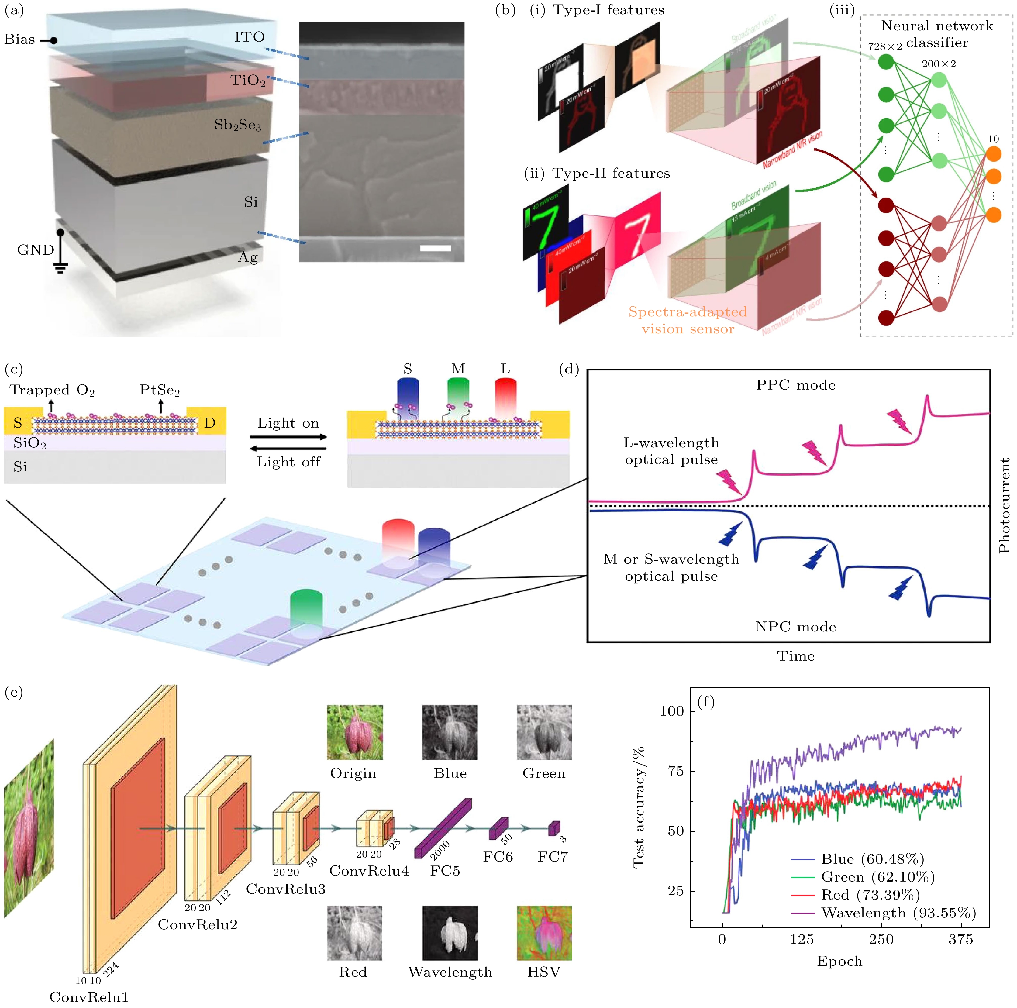 Fig. 6. (a) Cross-sectional schematic and SEM image of the device structure. Scale bar, 200 nm[68]; (b) operational scheme of the spectra-adapted vision system. Panels (i) and (ii) show examples of the imaging of typical type-I and type-II features by the spectra-adapted vision sensor, and panel (iii) sketches the architecture of the two-channel artificial neural network. Reproduced with permission from Ref.[68]; (c) ioinspired bilayer PtSe2 device for spontaneous chromatic adaptation. The O2-mediated bilayer PtSe2 device can simultaneously apply sensing, memory, and processing functions to color images[69]; (d) schematic of wavelength-dependent positive and negative nonvolatile photoconductivity, which mimics the antagonistic receptive field of a colored image and the memory of synaptic cells[69]; (e) CNN structure and different datasets. Origin and HSV are multichannel composite images. The red, blue, and green images are the three channels extracted on the basis of their pseudocolor image (origin). Hue is the wavelength channel of the HSV image[69]; (f) classification results of four datasets under the same network structure. The wavelength-dependent results show an average accuracy of 93.55%. The performance of the pseudocolor channels is 60.48% (blue), 62.10% (green), 73.39% (red). Reproduced with permission from Ref.[69].