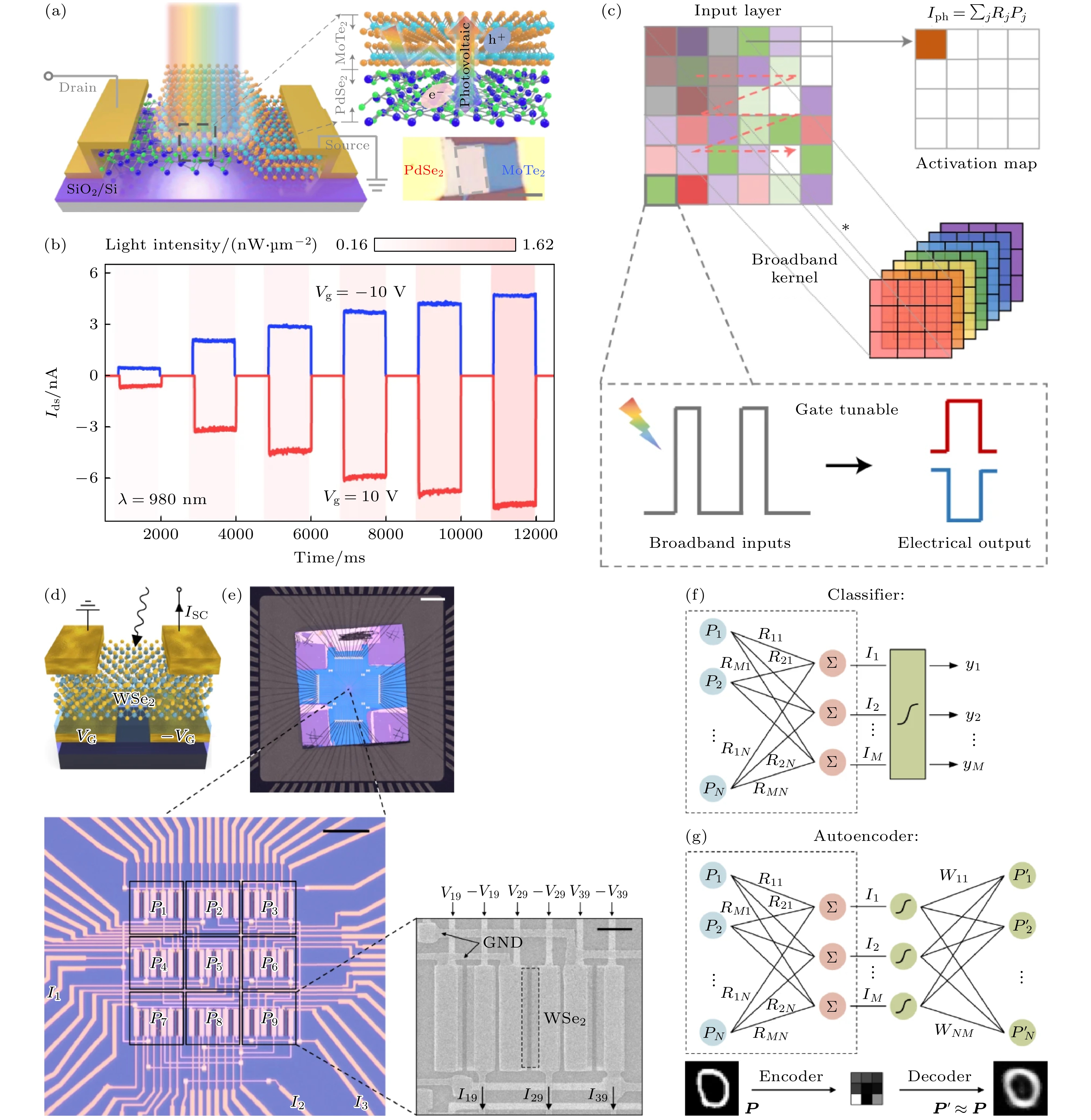 Fig. 8. (a) Schematic of the PdSe2/MoTe2 heterostructure device. The inset shows an optical image of the PdSe2/MoTe2 heterostructure[90]. (b) Positive and negative photoresponses under different light intensities at a wavelength of 980 nm (indicated by shadow areas) at Vg = –10 V and 10 V, respectively[90]. (c) Schematic of the mechanism for the broadband convolution calculation that derives a weighted electrical output from broadband optical inputs. The broadband kernel values can be represented by photoresponsivity (Rj), which can be tunable by Vg. The input layer is represented by the incident light. The pixel values are equivalent to optical power (Pj), and the output photocurrent can be represented with convolution operation conv (Pj, Vg). The inset shows the concept of gate-tunable weights for each pixel that derives the weighted positive and negative photoresponsivity. Reproduced with permission from Ref.[90]. (d) Schematic of a single WSe2 photodiode. The device is operated under short-circuit conditions and the photoresponsivity is set by supplying a voltage pair VG/–VG to the bottom-gate electrodes[80]. (e) Macroscopic image of the bonded chip on the chip carrier. First magnification: microscope image of the photodiode array, which consists of 3 pixel×3 pixel. Second magnification: scanning electron microscopy image of one of the pixels. Each pixel consists of three WSe2 photodiodes/subpixels with responsivities set by the gate voltages. Schematics of the classifier (f) and the autoencoder (g). Reproduced with permission from Ref.[80].