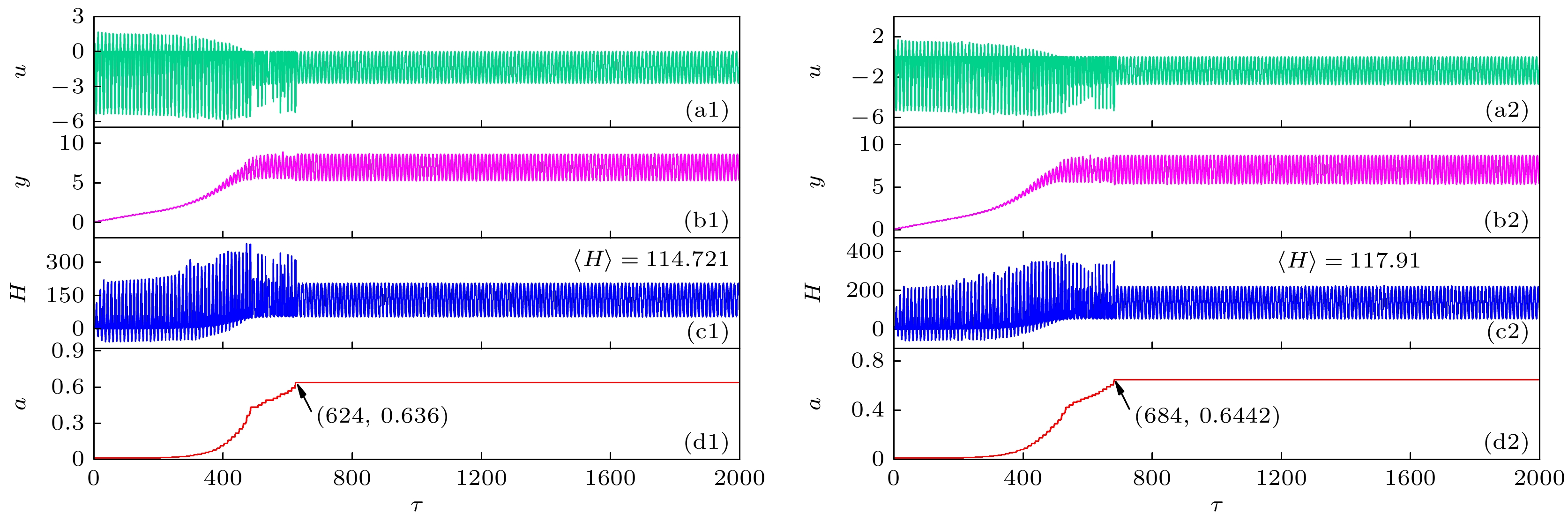 图 11 参数a依据方程(23)的能量自适应调节模式进行演化时, 不同阈值ε下(a1), (a2) u, (b1), (b2) y的时序图; (c1), (c2)哈密顿能量H和(d1), (d2)参数a随时间的演化曲线. 参考实际能量值对ε直接取值(a) ε1 = 262.7, σ1 = 0.1; (b) ε2 = 280.7, σ2 = 0.1. a的初始值ainitial = 0.001